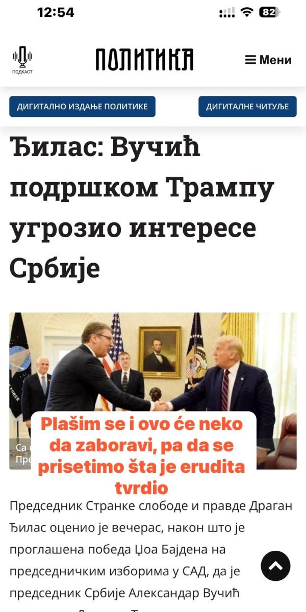 Samo nekoliko godina pre toga, nakon izbora u Sjedinjenim Američkim Državama na kojima je demokratski kandidat Džo Bajden odneo pobedu, optužio je Vučića da je podrškom Donaldu Trampu tokom predizborne kampanje ugrozio interese Srbije. No, ovo se takođe ispostavilo kao Đilasova redovna kuknjava, budući da se ništa nije promenilo u odnosu SAD prema našoj zemlji nakon stupanja Bajdena na vlast.
