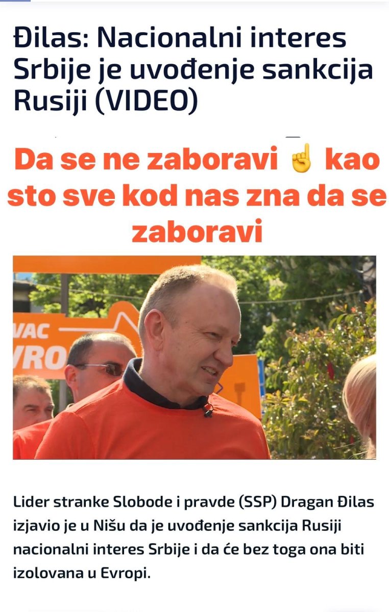 Krajem aprila 2023. godine Đilas se zalagao za uvođenje sankcije Rusiji, ističući da je to "nacionalni interes Srbije". Kako bi potkrepio svoje bizarne tvrdnje, pokušavao je da zaplaši srpski narod izjavama da će bez toga ona biti izolovana u Evropi. Ipak, prošle su skoro dve godine, Srbija nije uvela sankcije Rusiji, a nije ni ostala izolovana od ostalih država na Starom kontinentu.