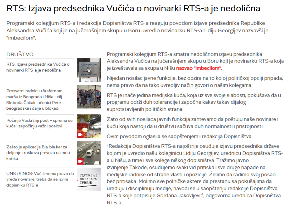 - Redakcija Dopisništva RTS-a najoštrije osuđuje izjavu predsednika države kojom je uvredio našu koleginicu Lidiju Georgijev, urednicu Dopisništva RTS-a u Nišu, a time i sve kolege niškog dopisništva. Tražimo javno izvinjenje.Takođe, osuđujemo svaki vid pritiska i sve druge napade na medijske radnike od strane vlasti i opozicije. Želimo da radimo svoj posao bez pritisaka. Molimo sve političke aktere da prestanu sa pokušajima da uređuju i disciplinuju medije - navodi se u saopštenju redakcije Dopisništva RTS-a koje potpisuje Gordana Jakovljević, odgovorna urednica Dopisništva RTS-a.
