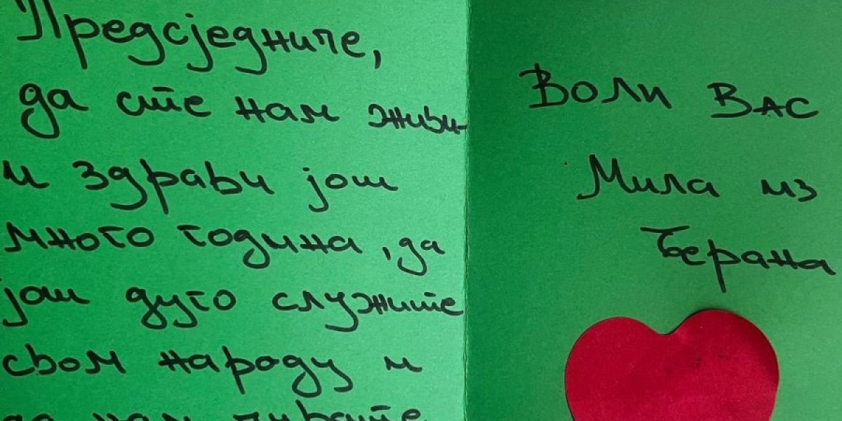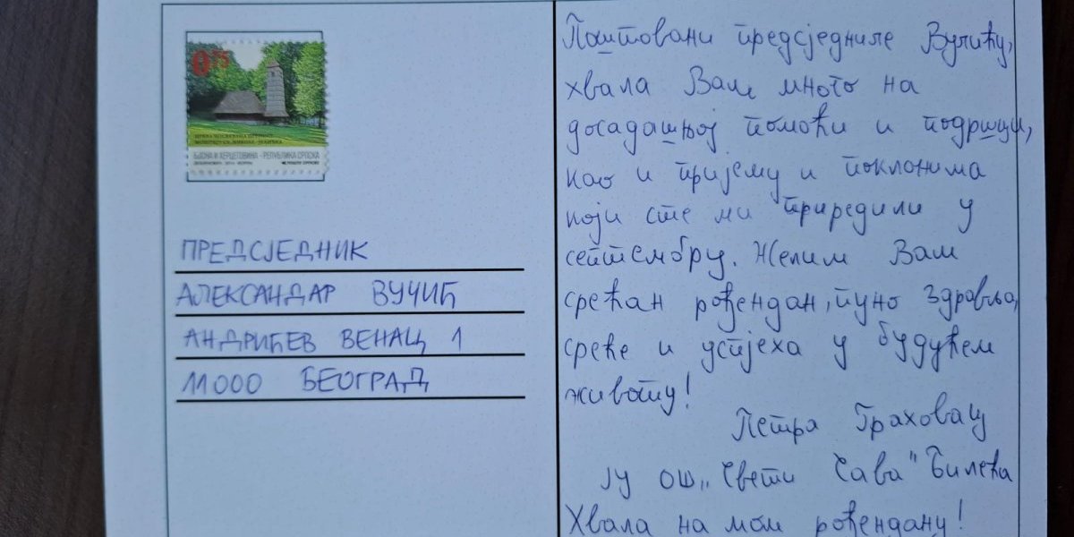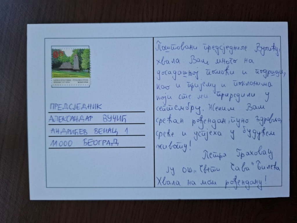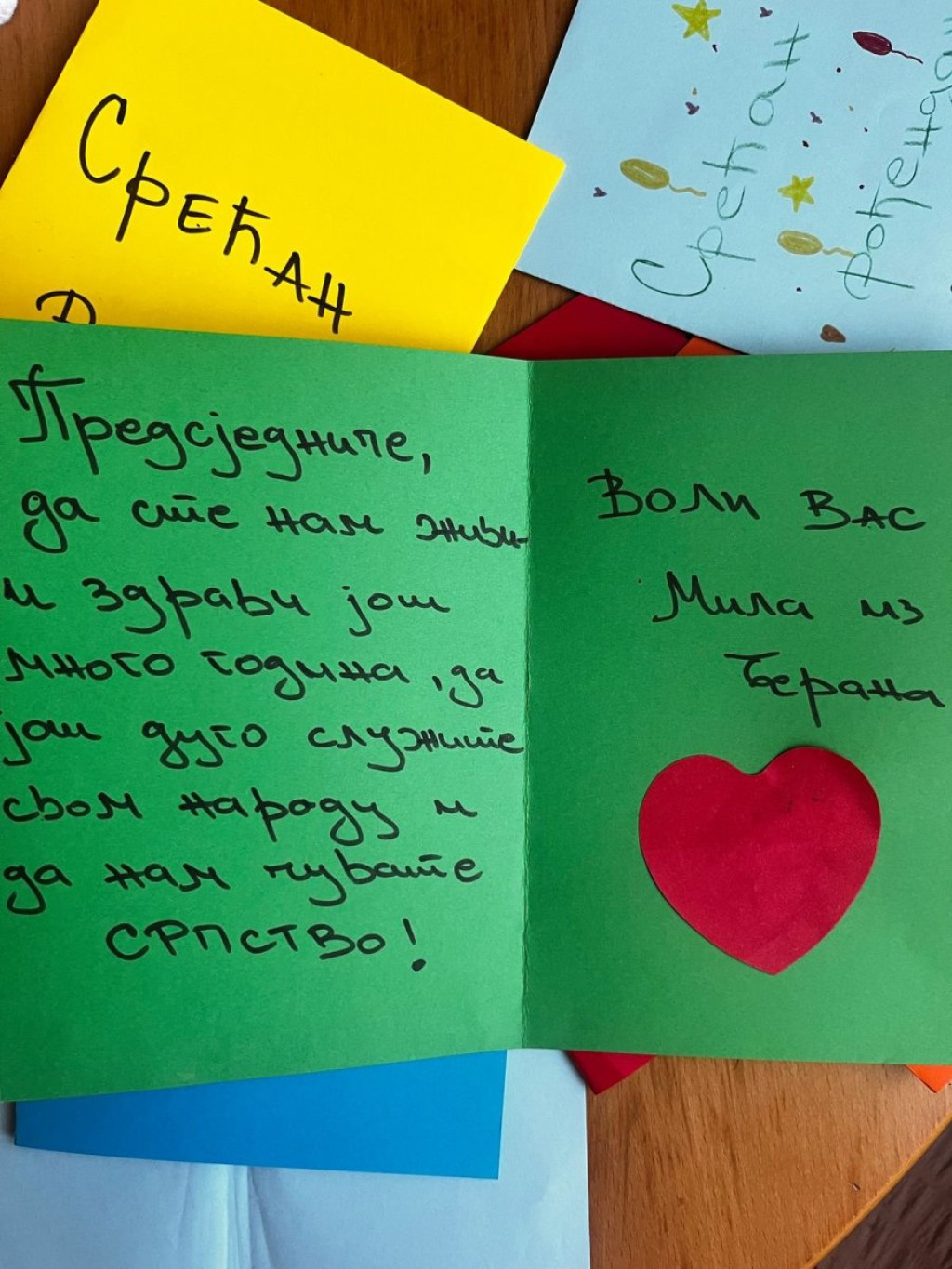-Poštovani predsjedniče Vučiću, hvala Vam mnogo na dosadašnjoj pomoći i podršci, kao i prijemu i poklonima koje ste mi priredili u septembru. Želim Vam srećan rođendan, puno zdravlja, sreće i uspjeha u budućem životu - piše u čestitki dečaka iz Bileće.