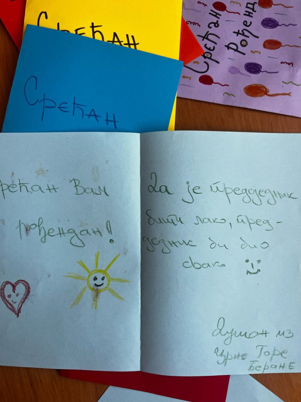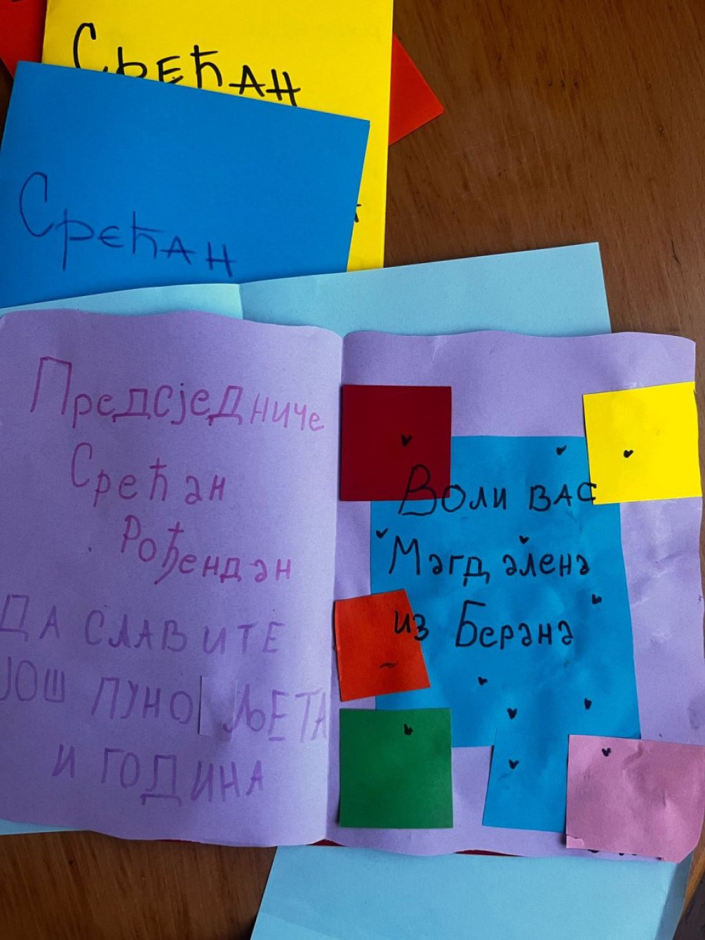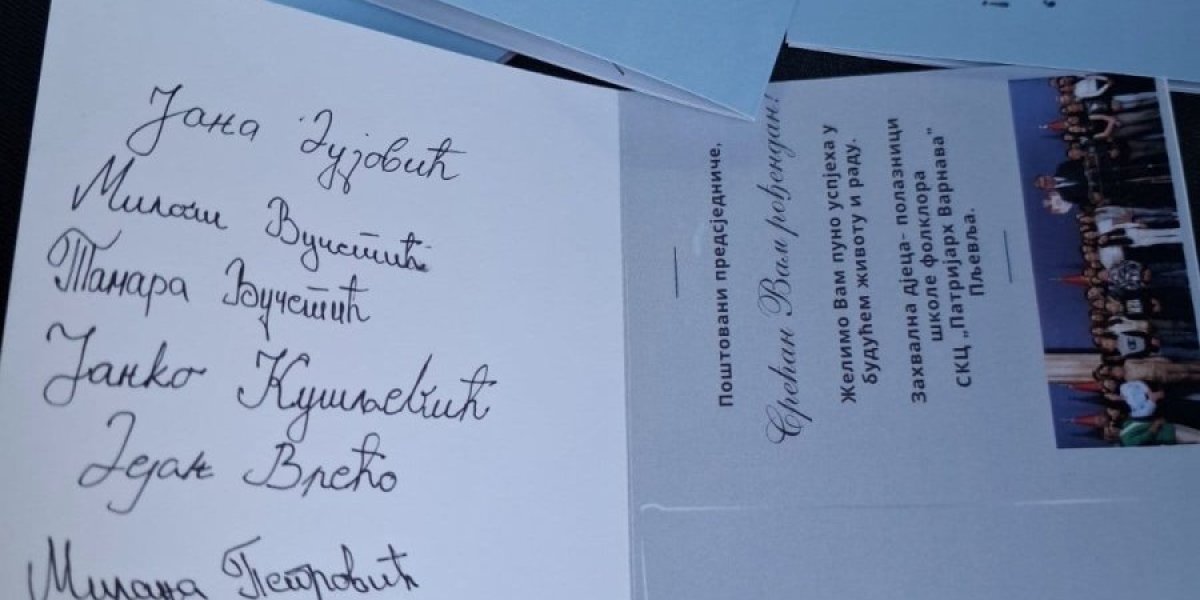 -Poštovani predsjedniče Vučiću, hvala Vam mnogo na dosadašnjoj pomoći i podršci, kao i prijemu i poklonima koje ste mi priredili u septembru. Želim Vam srećan rođendan, puno zdravlja, sreće i uspjeha u budućem životu - piše u čestitki dečaka iz Bileće.
