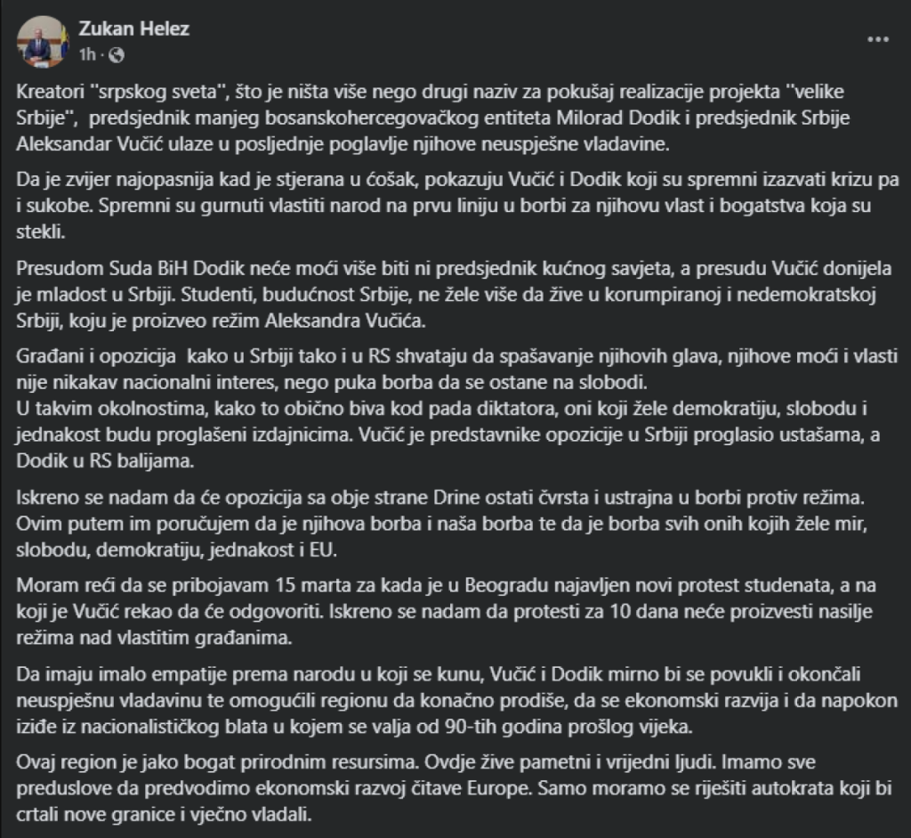 - Da je zver najopasnija kad je stjerana u ćošak, pokazuju Vučić i Dodik koji su spremni izazvati krizu pa i sukobe. Spremni su gurnuti vlastiti narod na prvu liniju u borbi za njihovu vlast i bogatstva koja su stekli - bulazni Helez u postu koji je objavio na Fejsbuku.