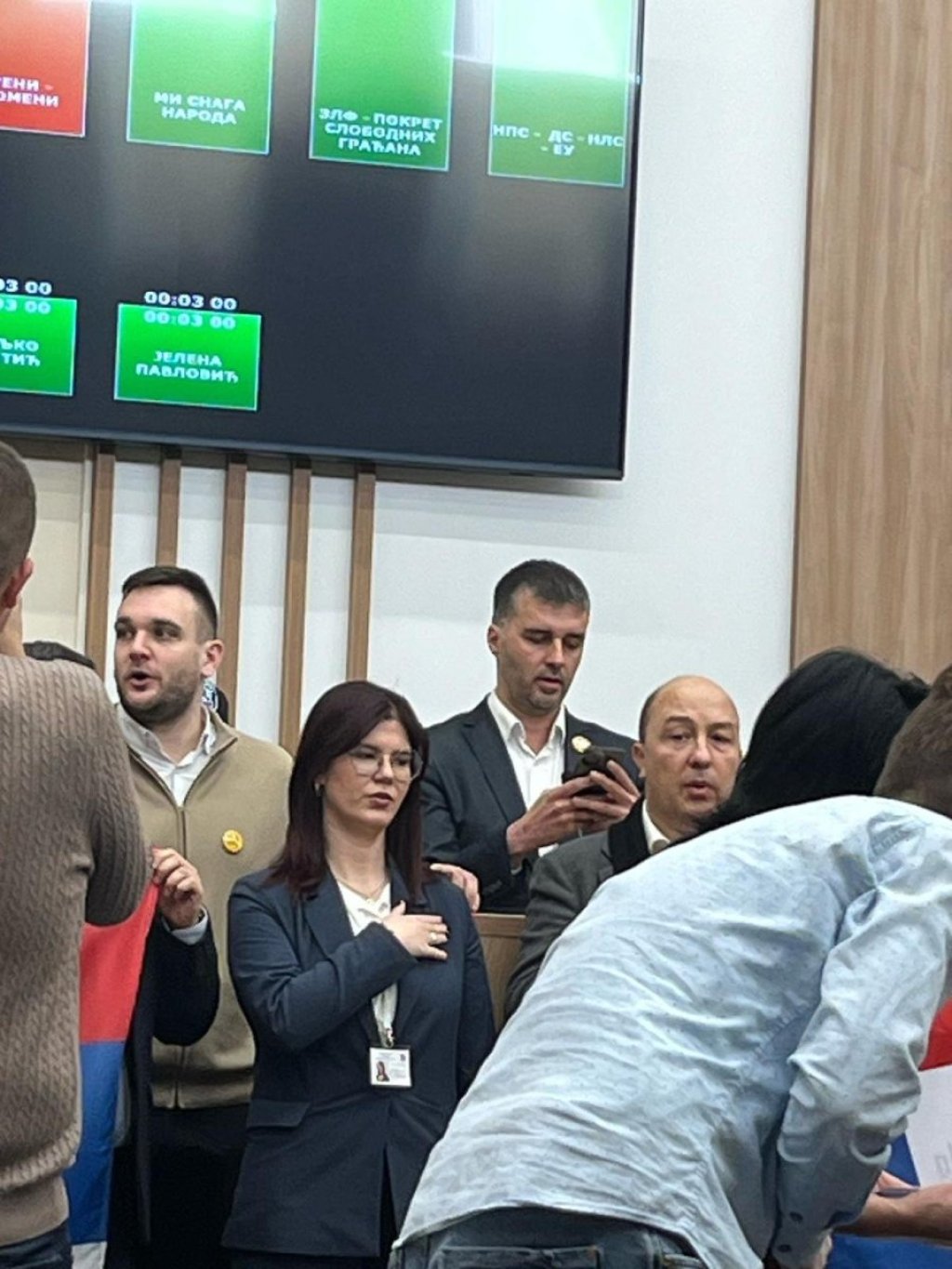 Odbornici dela opozicije su od početka sednice sa zvučnika neprekidno puštali himnu "Bože pravde', stajali i držali razvijene zastave Srbije.