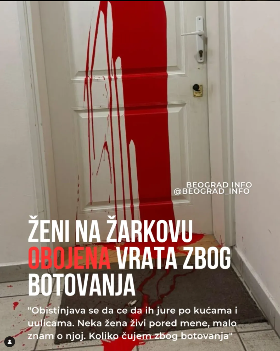 Kako se navodi na Instagram stranici Beograd info, ženi čiji identitet u trenutku objavljivanja ovog teksta nije poznat, ekstremisti su obojili su ulazna vrata stana crvenom farbom.