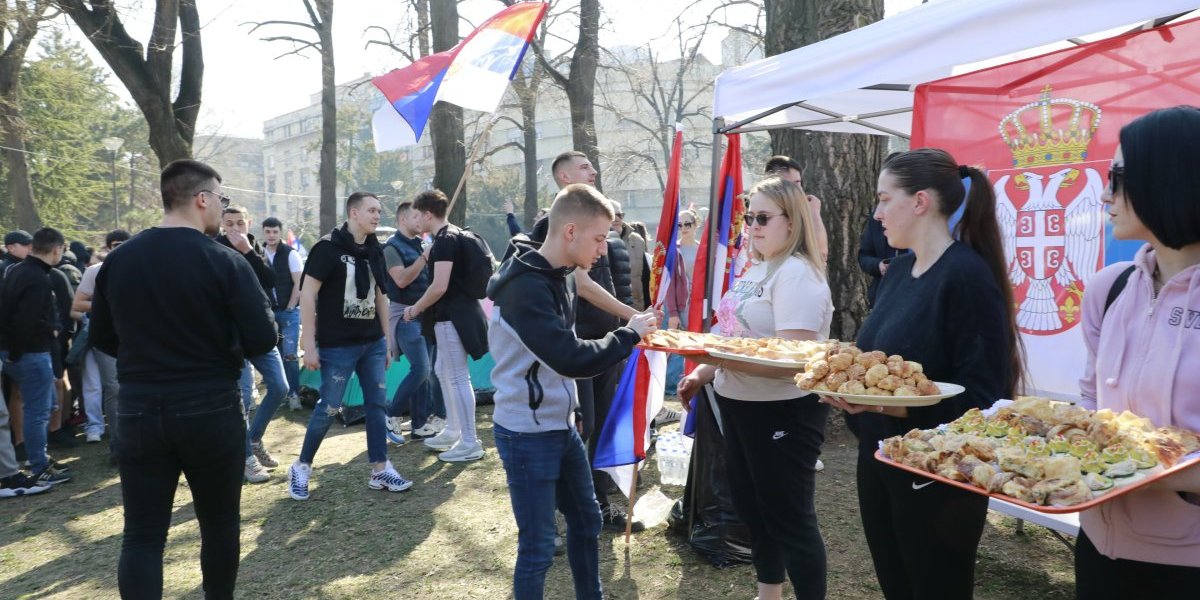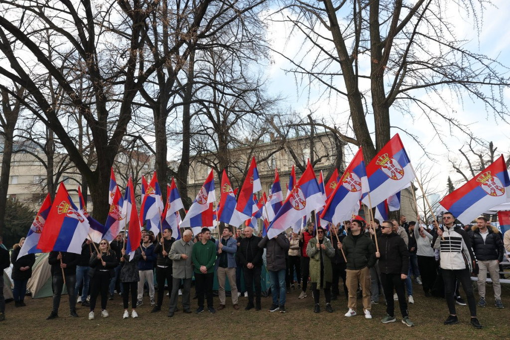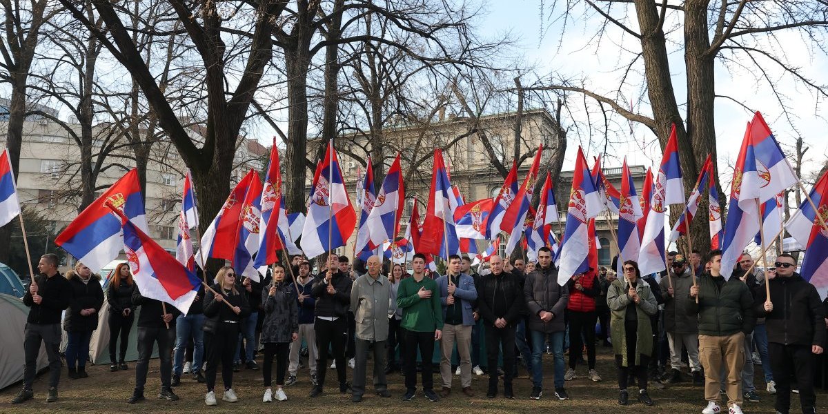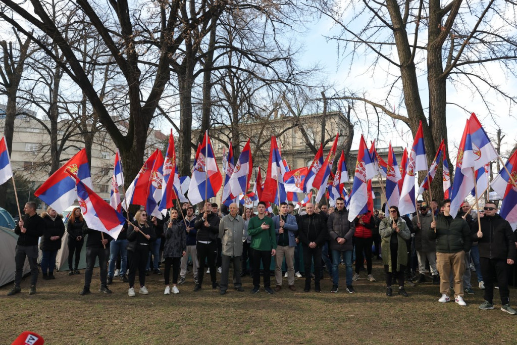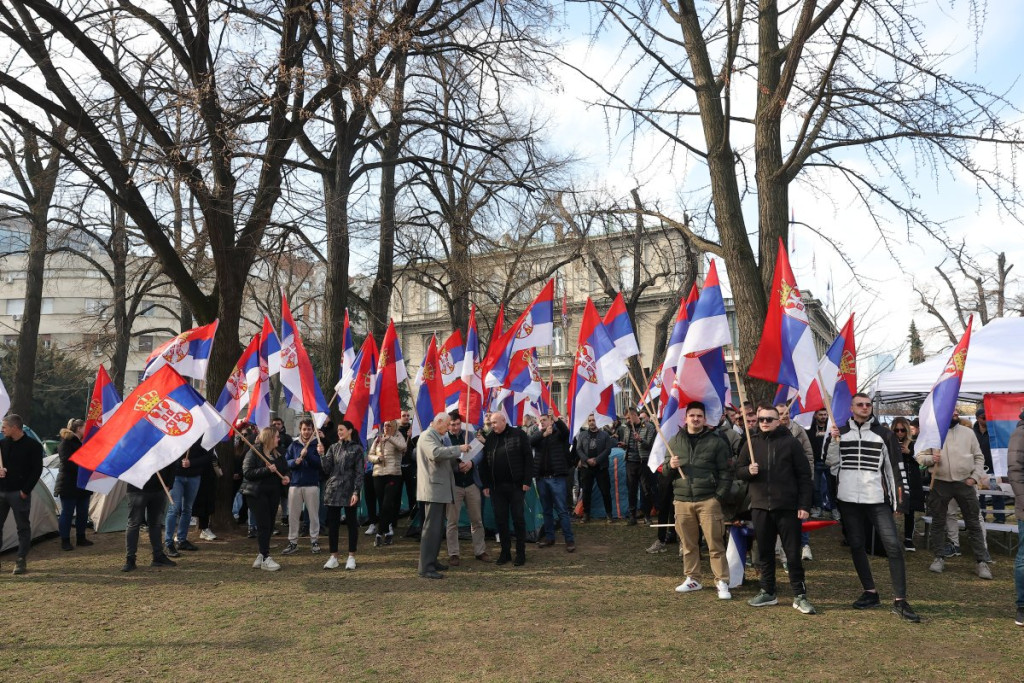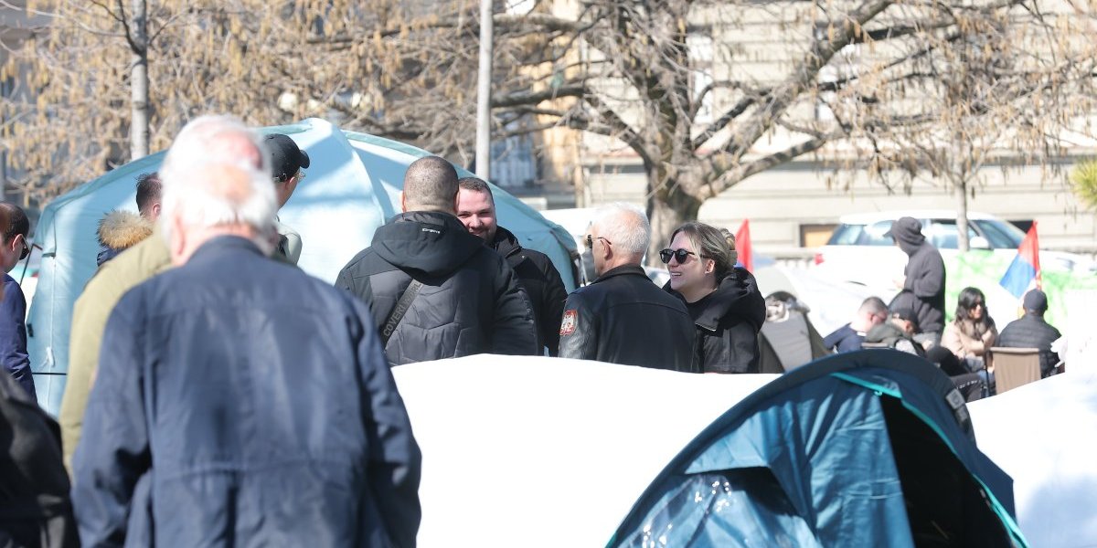 Studenti koji zahtevaju prekid blokade fakulteta okupili su se u četvrtak ispred Predsedništva. Nakon napada na studente koji žele da uče koji se nisu povukli pred neradnicima i zgubidanima, atmosfera u kampu je potpuno smirena. Oni pevaju "Veseli se srpski rode".