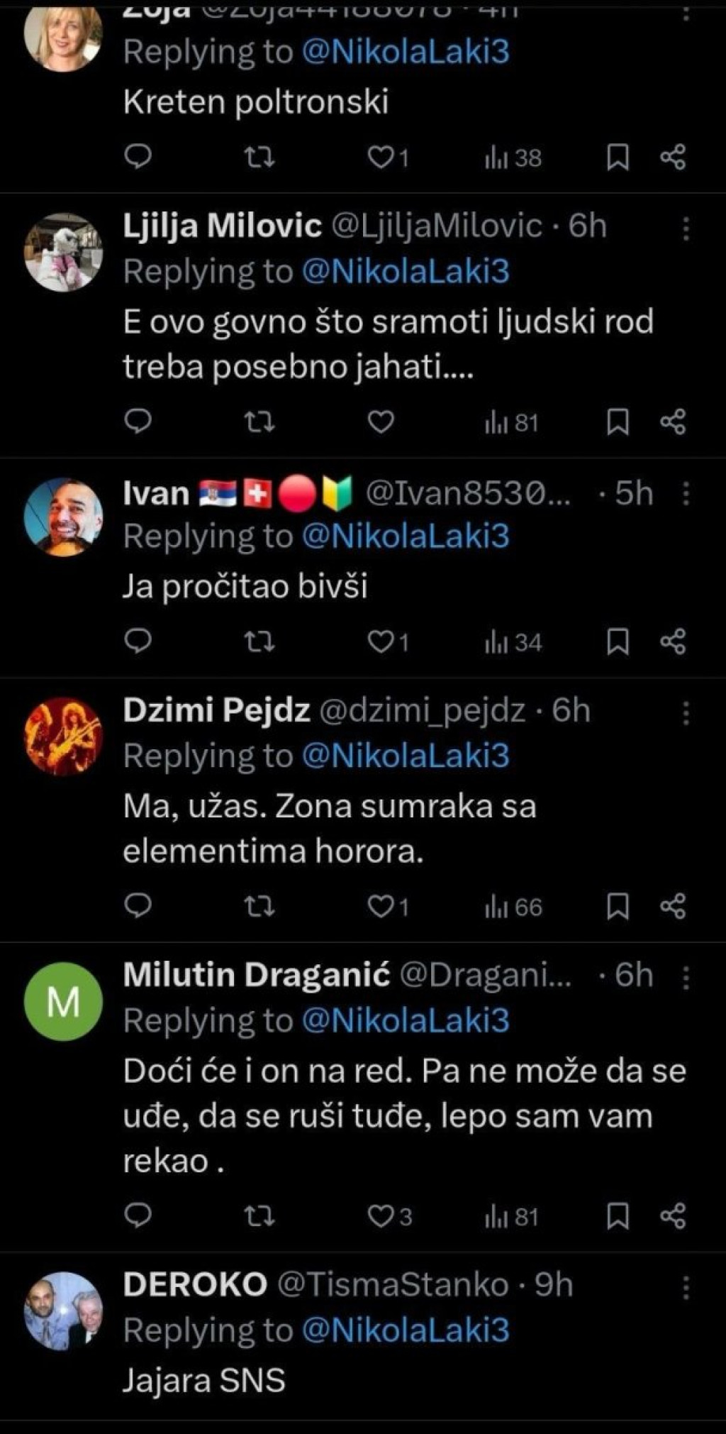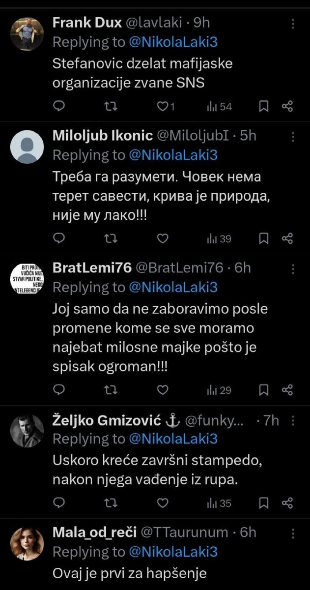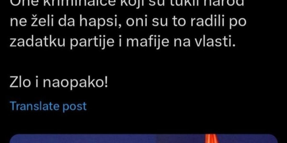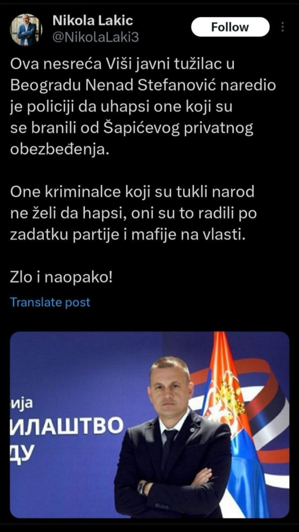 ''Ova nesreća Viši javni tužilac u Beogradu Nenad Stefanović naredio je policiji da uhapsi one koji su se branili od Šapićevog privatnog obezbeđenja. One kriminalce koji su tukli narod ne želi da hapsi, oni su to radili po zadatku partije i mafije na vlasti. Zlo i naopako!'', napisao je izvesni Lakić na mreži Iks.