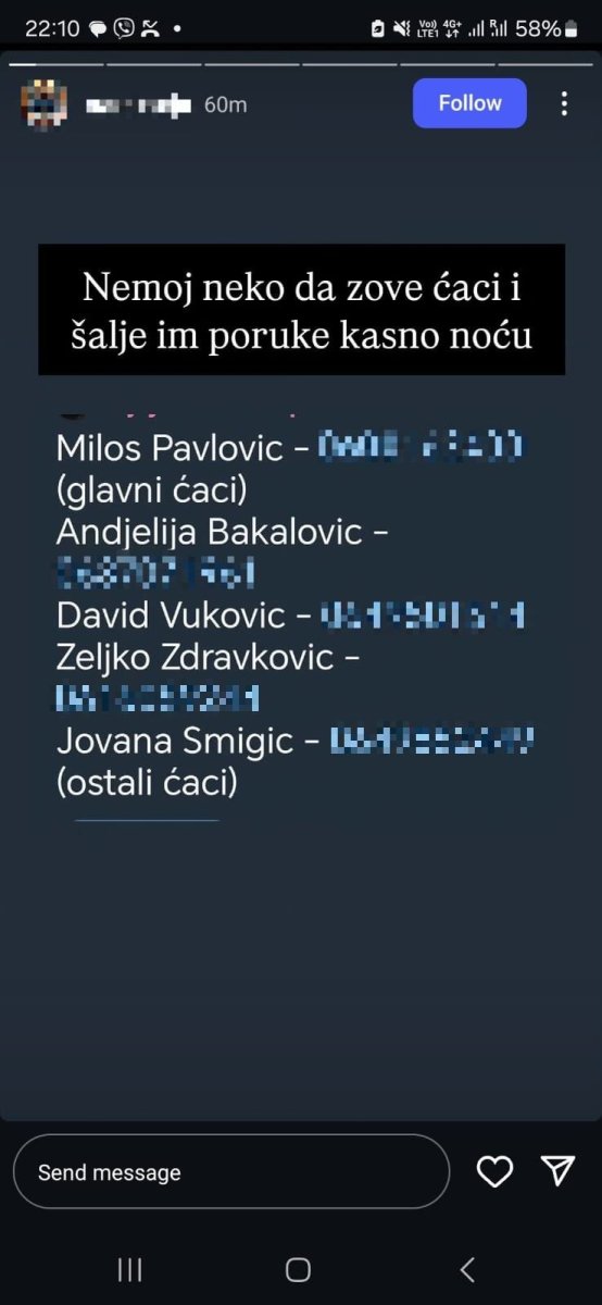 Ovoga puta, jedna Instagram stranica odlučila je da javno objavi brojeve telefona poznatijih članova skupova, odnosno, kako su naveli, "glavnih ćacija".
