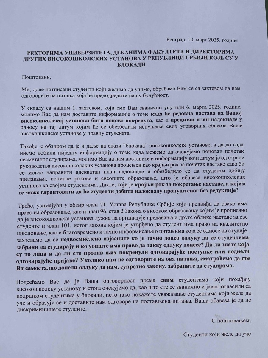 - Molimo da nam dostavite informacije o tome kada će nastava biti pokrenuta. Do sada nismo dobili nijednu informaciju o tome kada će početi studiranje, molimo Vas da nam dostavite krajnji rok početka nastave kako bismo mogli da nadoknadimo nastavu. Po Ustavu, svako ima pravo na obrazovanje, a visokoškolske ustanove su dužne da pruže školovanje, Izjasnite se ko je dozvolio da se obustavi nastava. Ukoliko ne odgovorite na pitanja, smaraćemo da ste nam suprotno zakonu zabranili da studiramo - kazao je Pavlović, koji dodaje da zahtevaju i datum koji je krajnji rok za pokretanje nastave.