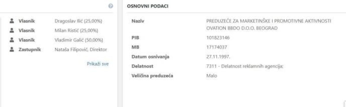 Uvidom u javno dostupne podatke Agencije za privredne registre (APR) otkriva se da je suvlasnik te firme Đilasov partner Dragoslav Ilić. Ilić je sa Đilasom vlasnik firme Multikom group, a suvlasnik je Ovation BBDO (kompanije sestre), u kojoj rade Marjanović, Bahilj. Postavlja se pitanje da li je slučajnost da upravo oni, koji se gotovo isključivo bave aktivizmom na mrežama i širenjem radikalnih poruka sa pozivima na nasilje, rade za firmu u kojoj je Đilasov poslovni partner vlasnik?