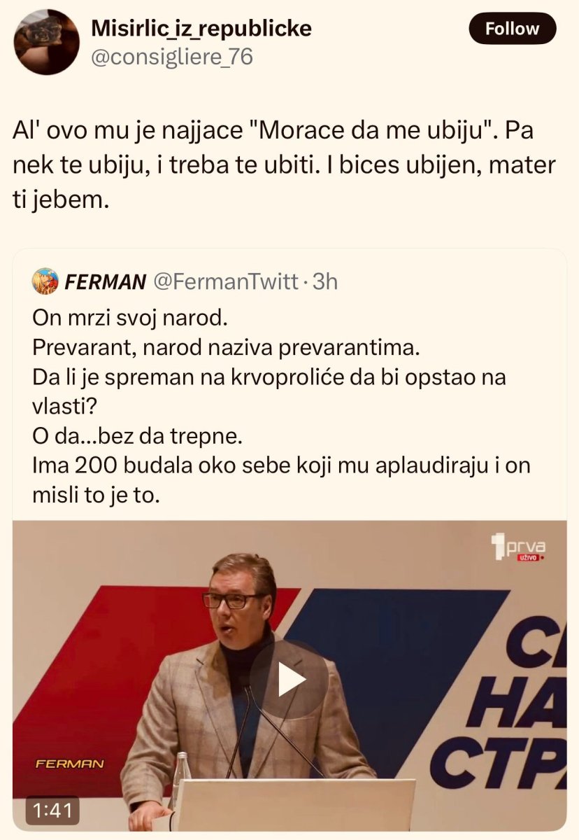 Opozicioni tviteraš koji se na društvenoj mreži X potpisuje kao Misirlić_iz_republičke uputio je otvorene pretnje predsedniku Srbije Aleksandru Vučiću.