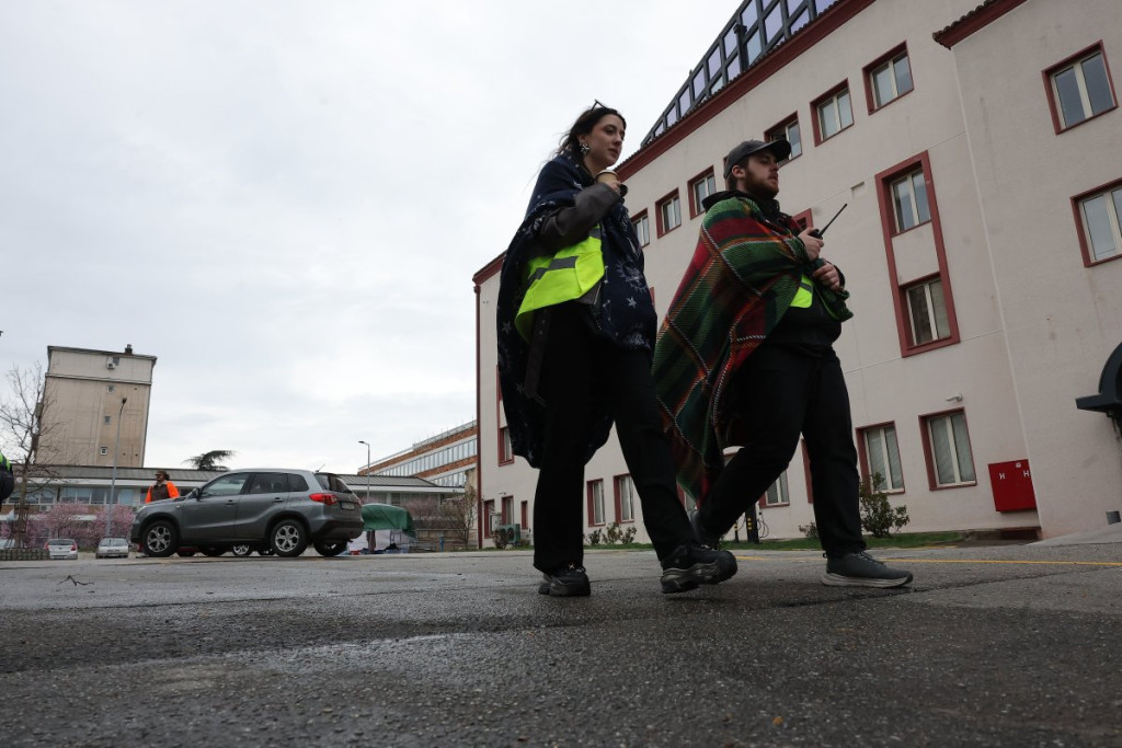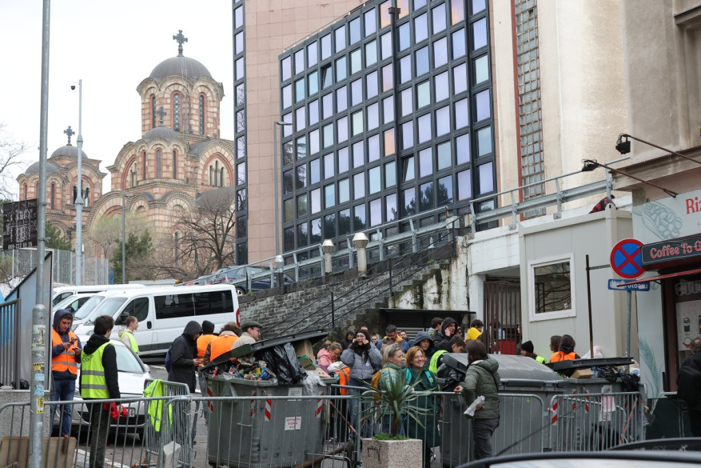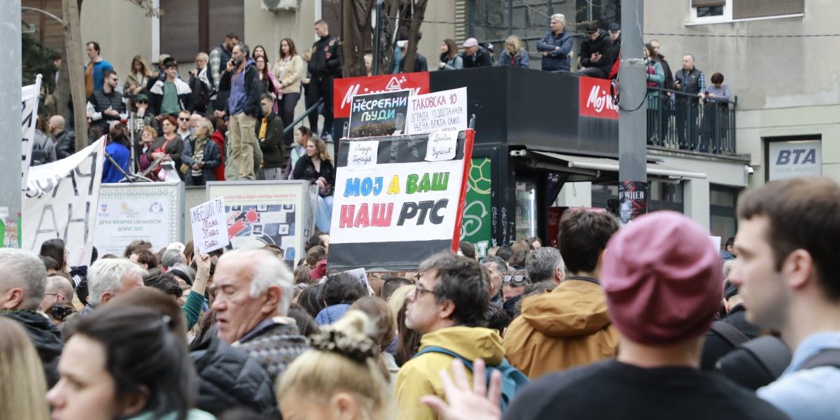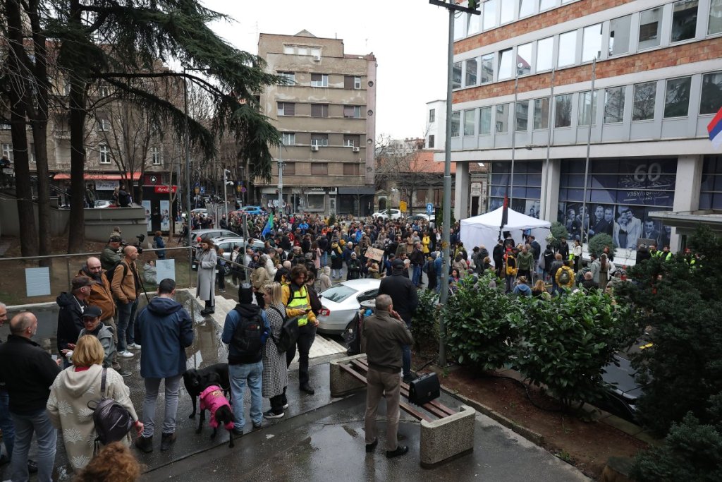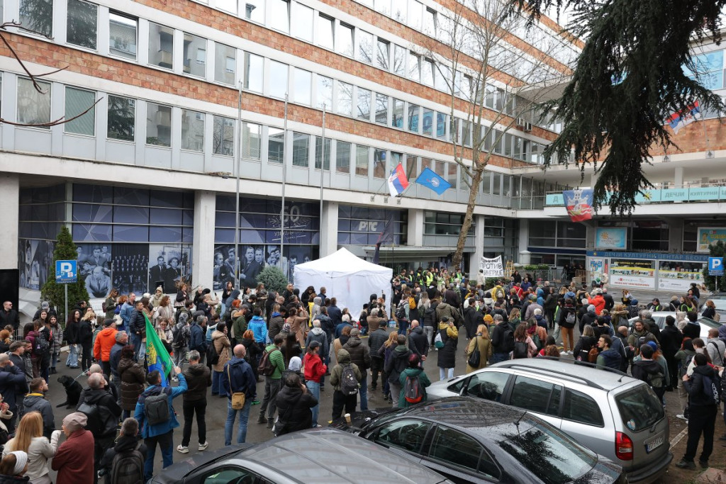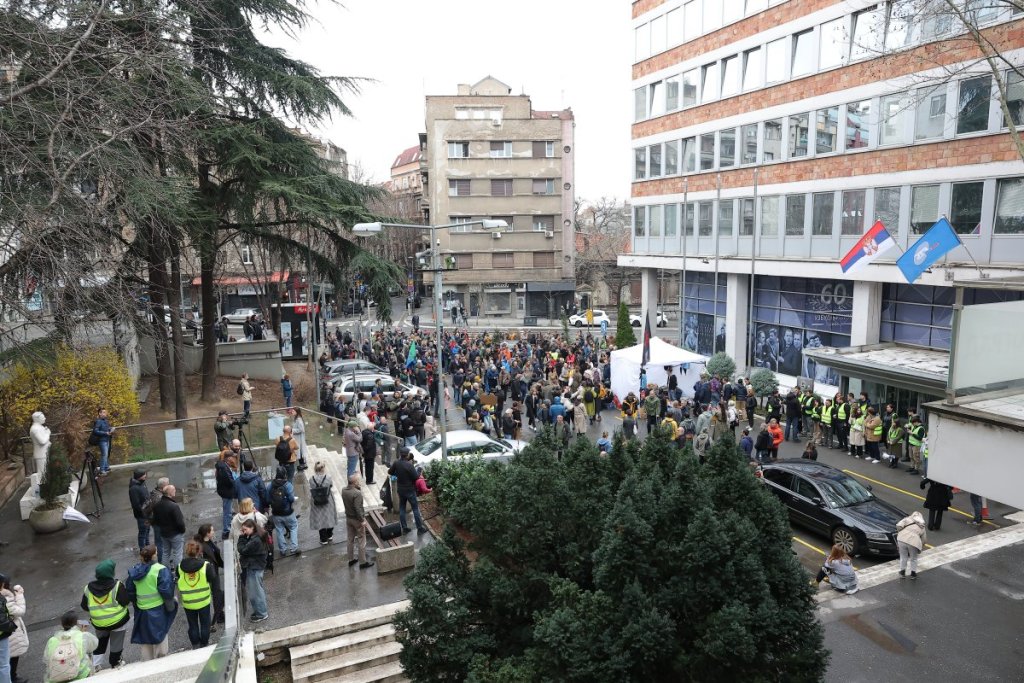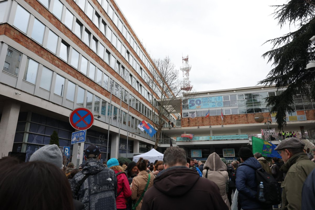 Inače, njih 50 pišti i duva u vuvuzele, nema ih više. Oni blokiraju sva tri ulaza u zgradu RTS.