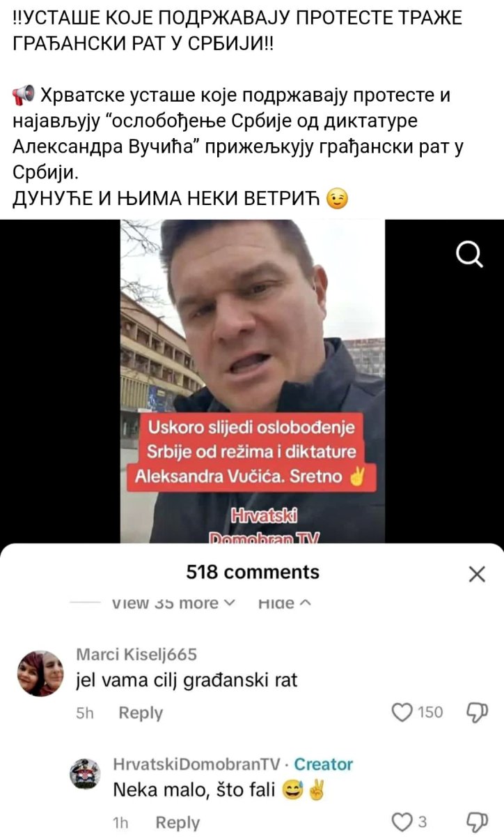 Hrvatske ustaše koje podržavaju proteste i najavljuju "oslobođenje Srbije od diktature Aleksandra Vučić", priželjkuju građanski rat u Srbiji.