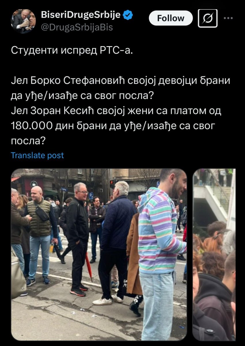 Poznata lica viđena su sinoć na nasilnom skupu ispred RTS-a, u kom je teško povređen policajac Lazar Baćić. Među prisutnima koji su dali podršku blokaderima našao se bračni par Kesić, čija supruga upravo radi za RTS, a društvo im je pravila žena tajkuna i glumca Dragana Bjelogrića.