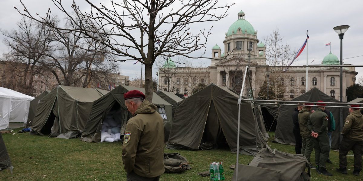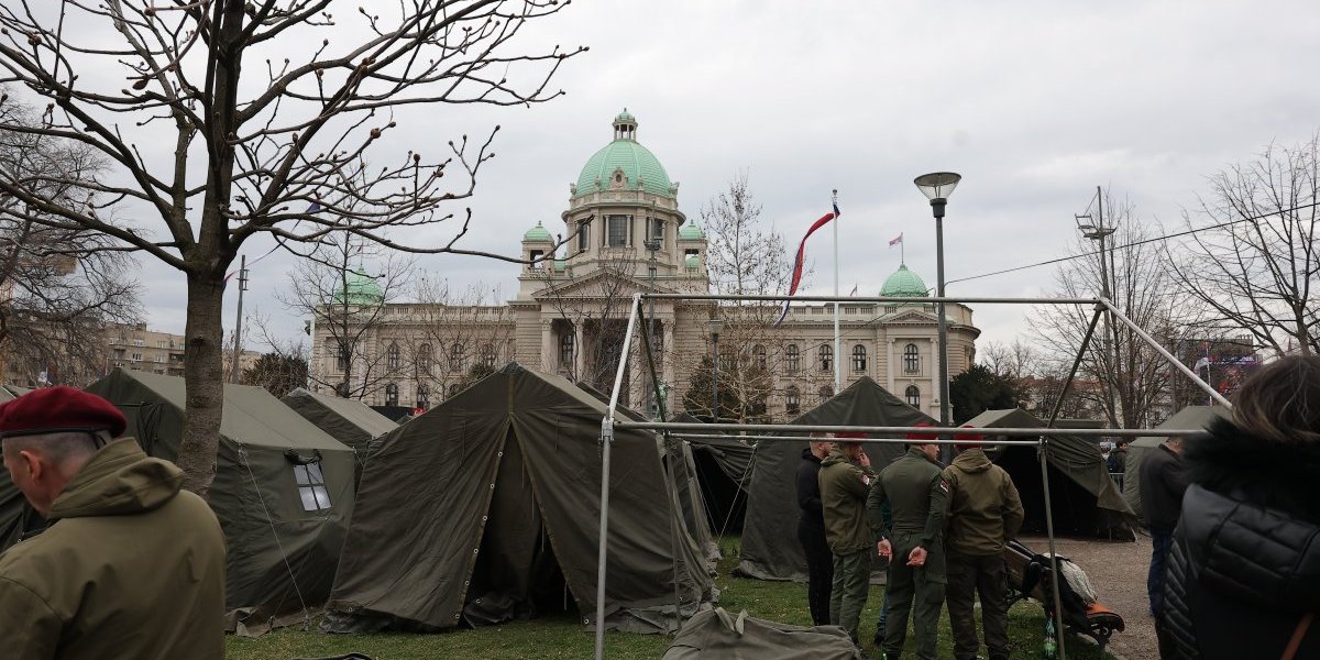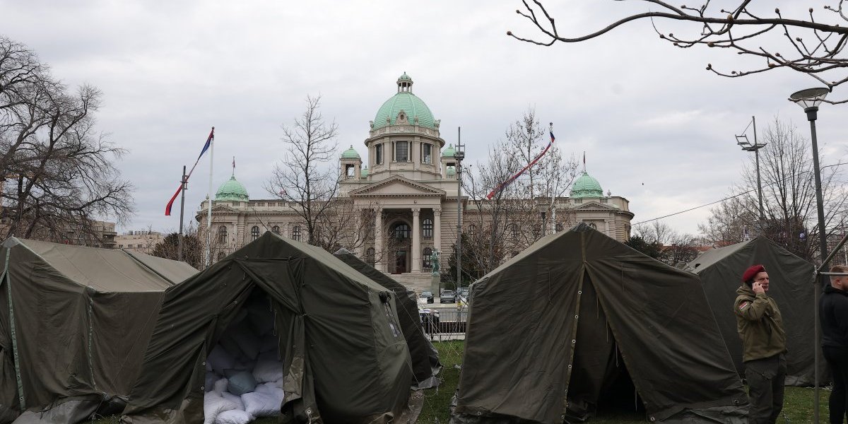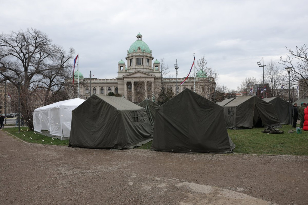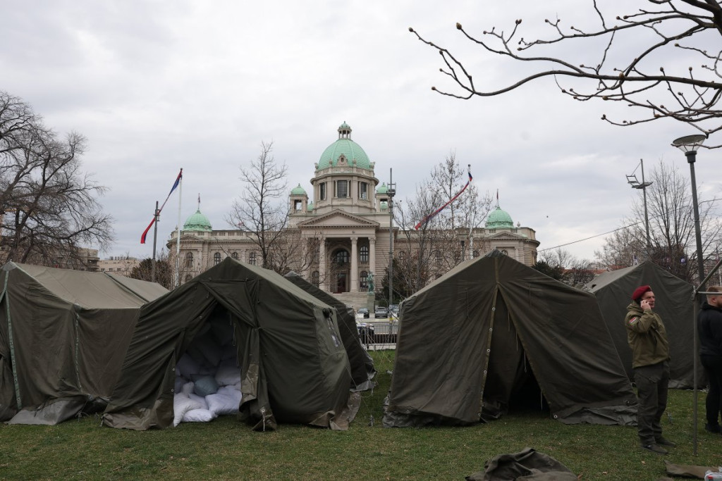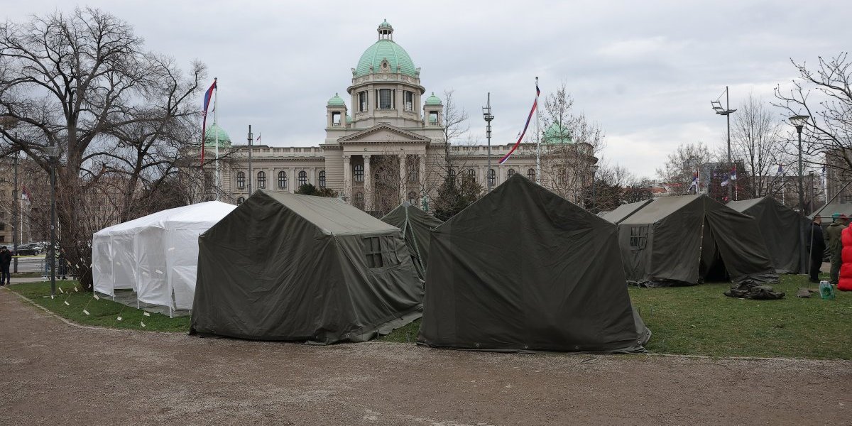 Podli lažov Aleksić je iz prostorija Narodne skupštine fotografisao zelene šatore u Pionirskom parku i napisao samo dve reči, želeći da time izdramatizuje situaciju.