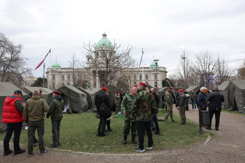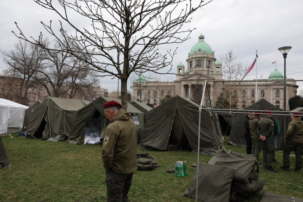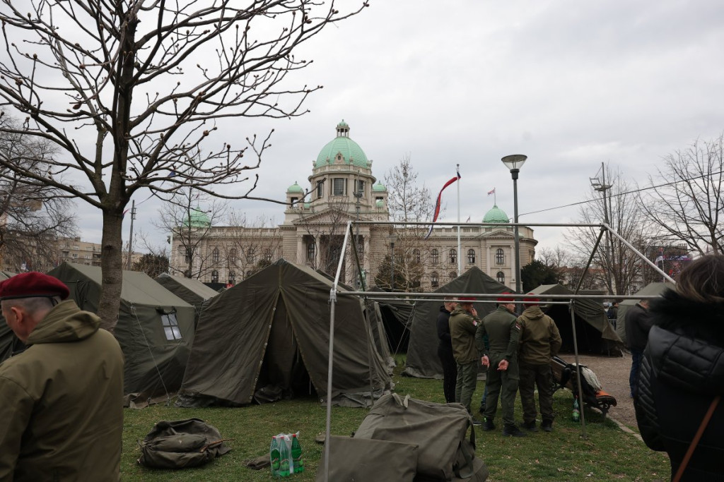 Informerova ekipa, koja već danima izveštava sa skupa studetana koji žele da uče, imala je direktan uvid u "vojni desant". Reč je naime o zelenim šatorima u kojima se nalaze ćebad i jastuci za studente.