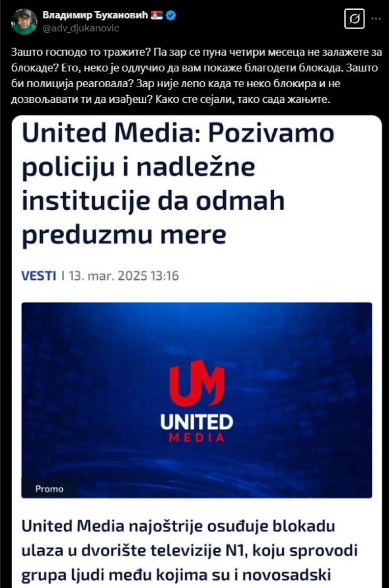 Na portalu N1 odmah je objavljen naslov: "Junajted Medija: Pozivamo policiju i nadležne institucije da se odmah preduzmu mere".