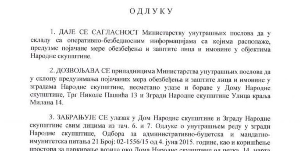 "Hvala vam na razumevanju i ujedno vas pozivamo da svi zajedno učinimo sve da skup u subotu prođe mirno i bez ikakvih incidenata", navodi se u odluci upućenoj poslanicima i zaposlenima u Skupštini Srbije.