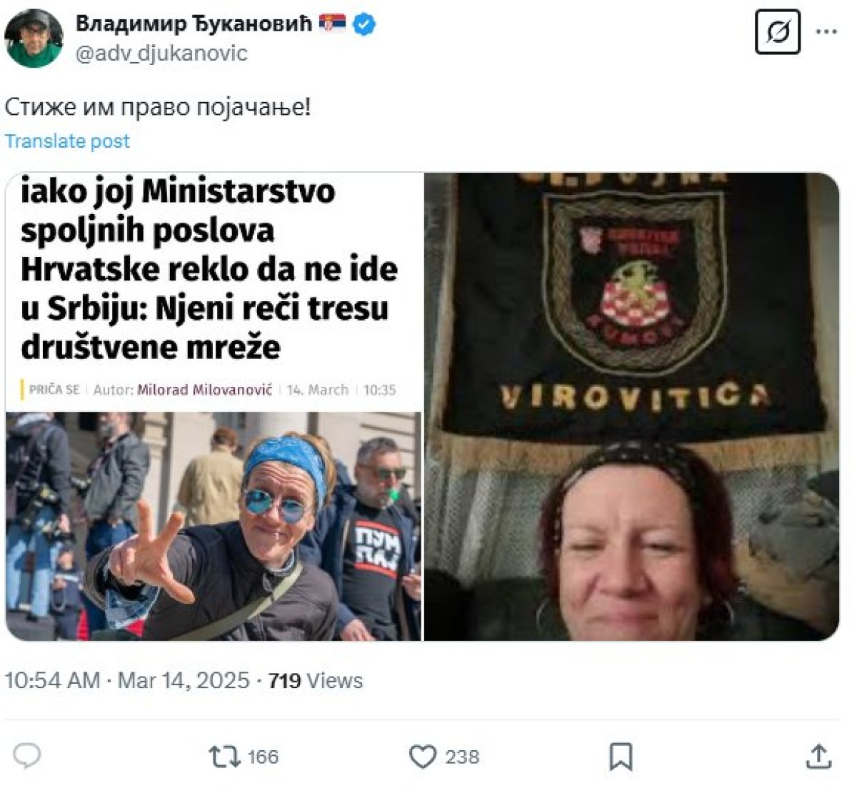 I kao što se može videti na fotografiji koju je podelio Đukanović ova žena iz Hrvatske uz osmeh se slika sa ispred zastave "81. gardijske bojna HV "Kumovi" koja je dobro poznata po svojoj ulozi u hrvatskoj zločinačkoj akciji "Oluja" koja je rezultirala stravičnim etničkim čišćenjem Srba. Podsetimo, u ovoj zločinačkoj akciji ubijeno je ili nestalo oko 2.000 Srba, a proterano više od 220.000.