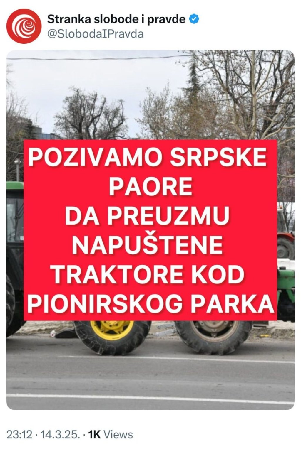 Stranka slobode i pravde Dragana Đilasa postavila je objavu u kojoj pozivaju da se pokradu traktori poljoprivrednika koji su došli da svojim traktorima zaštite živote studenata koji žele da uče i da im pruže podršku!