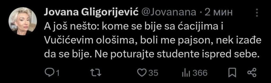 - Danas, kada cela Srbija strepi i većina poziva na mir i toleranciju, Šolakovi mediji objavljuju da je krvava šaka početak „duhovite revolucije“?!? I to VEOMA DUHOVITE revolucije! Šolakovi mediji, direktni podstrekači podela i mržnje u našem društvu su ponovo pokazali da su izgubili svaki moralni kompas i svaku vrstu ljudske empatije. Radi revolucije koju toliko ostrašćeno žele i očajnički pumpaju, oni vređaju žrtve novosadske tragedije, njihove porodice, čitavo naše društvo. Veoma duhovita revolucija?!? Ponovo: VEOMA DUHOVITA REVOLUCIJA??!?? Upravo zbog ovakvih stvari su istupili i članovi porodica Firić, Švonja, Raca i Milosavljević, koje su svoje najmilije izgubili u padu nadstrešnice da kažu da traže pravdu, pravdu u institucijama i da ne žele više da gledaju karnevalske atmosfere, nasilje, muziku, žurke, a sada i da čitaju da je njihova bol podstakla „duhovitu revoluciju“! - navela je na Iksu.