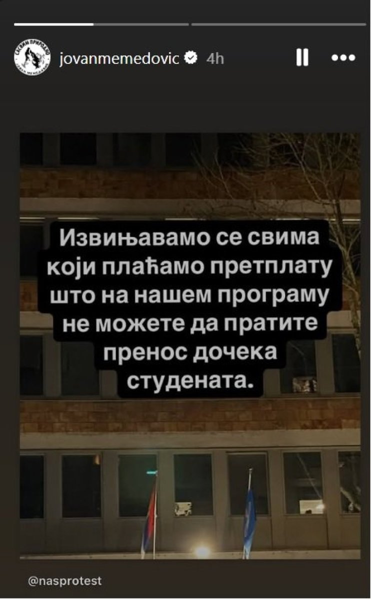 "Izvinjavam se svima koji plaćamo pretplatu, a što na našem programu ne možete da pratite prenos dočeka studenata", napisao je Memedović na društvenoj mreži Instagram, koji istovremeno podržava blokade i napad na RTS, ali i dalje uzima pare.