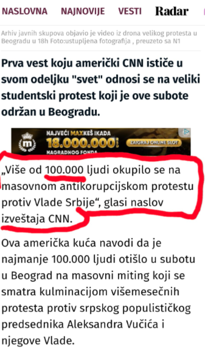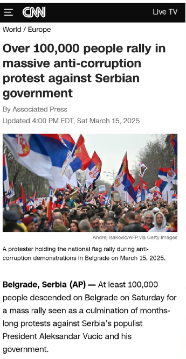 - Više od 100. 000 ljudi okupilo se na masovnom antikorupcijskom protestu protiv Vlade Srbije - glasi naslov izveštaja CNN.