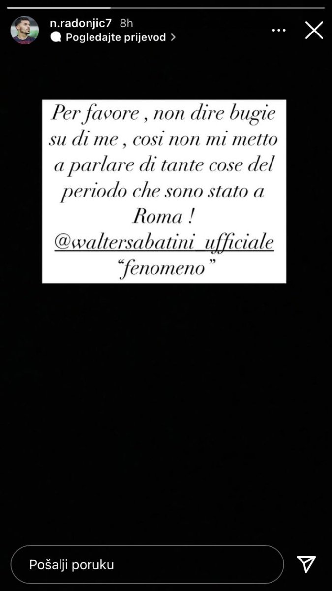 Nemanja Radonjić odgovorio je bivšem sportskom direktoru Rome - Valteru Sabatiniju, nakon što je Italijan u medijima izneo tvrdnje o njegovom ponašanju tokom boravka u Romi. Srpski fudbaler poručio mu je da prestane da širi neistine, inače će i sam progovoriti o dešavanjima iz tog perioda.