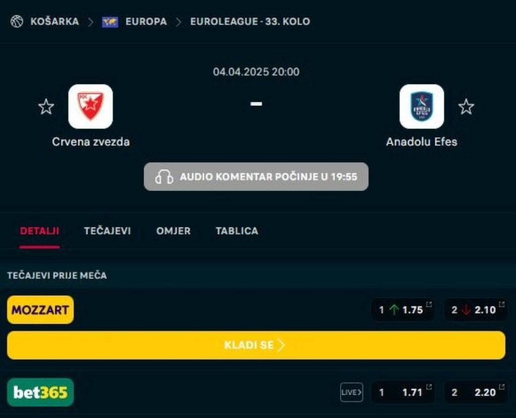 Košarkaši Crvene zvezde večeras u Beogradskoj areni dočekuju turski Efes (20.00, Arena premijum 1), u prvom od dva sudbonosna meča u Evroligi, a prema mišljenju svetskih kladionica, veliki su favoriti da iz istog izađu kao pobednici.