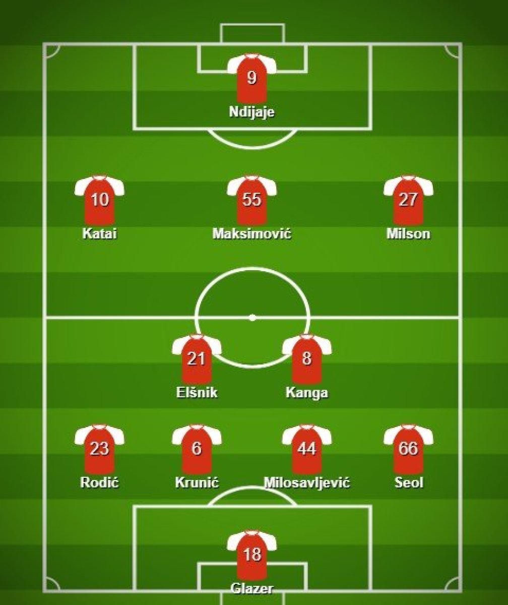 Tim Zvezde (4-2-3-1): Glazer - Seol, Milosavljević, Krunić, Rodić - Kanga, Elšnik - Milson Maksimović, Katai - Endiaje.