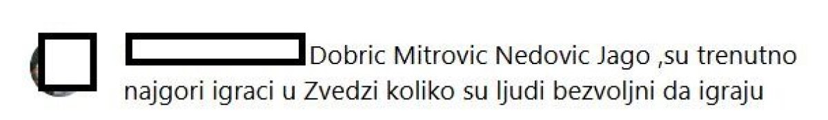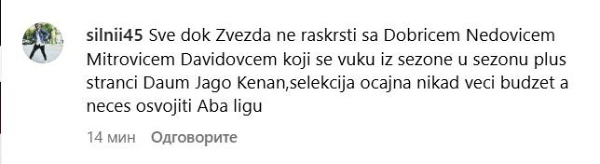 "Sve dok Zvezda ne raskrsti sa Dobrićem, Nedovićem, Mitrovićem, Davidovcem koji se vuku iz sezone u sezonu plus stranci Daum, Jago, Kenan, selekcija nikad veći budžet a nećeš osvojiti Aba ligu", "Dobrić, Mitrović, Nedović, Jago, su trenutno najgori igrači u Zvedzi koliko su ljudi bezvoljni da igraju", "Kakva skupina građana koji uopšte nemaju želju za igrom, kao da ih neko puškom naterao da igraju, al tu su domaće snage koji muzu klub godinama ugovorim, a nikakav doprinos u Euroligi jel ova ekipa bez prednosti domaćeg terena nema šta tražiti u finalu ABA",