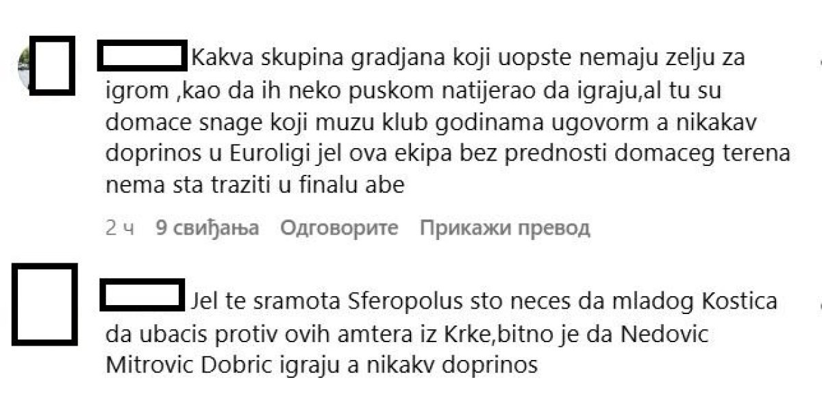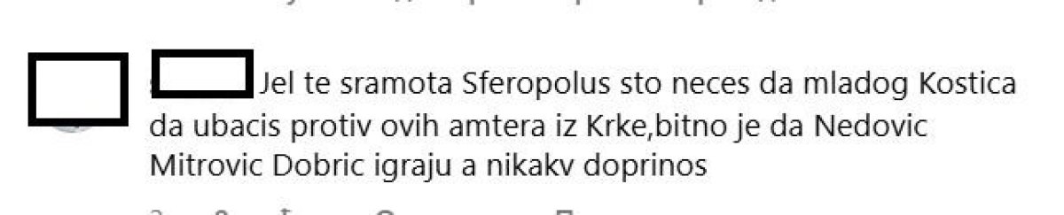 "Jel te sramota Sferopolusu što nećeš da mladog Kostića ubaciš protiv ovih amtera iz Krke, bitno je da Nedović, Mitrović i Dobrić igraju, a nikakv doprinos.