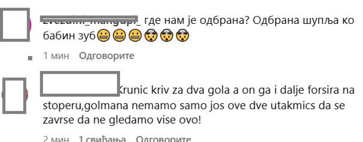 "Gde nam je odbrana? Odbrana šuplja kao babin zub", "Krunić kriv za dva gola, a on ga i dalje forsira na štoperu, golmana nemamo samo još ove dve utakmice da se završe da ne gledamo više ovo", "Milojevićeva polusezona vraćanje ekipe unazad. Totalno unazadio ekipu i većinu igrača. Zločin je Krunić na štoperu", "Dragi Bože, ova sezona je najtužnija u 35 godina koliko pratim Zvezdu, to govori i broj navijača na utakmicama. Nama drugi protivnik ne treba, sami smo sebi najveći", poručuju navijači Zvezde.