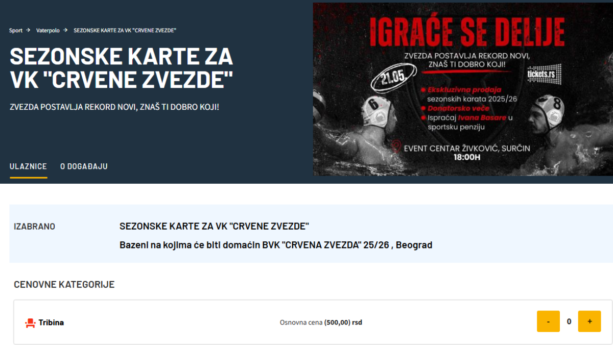 Vaterpolo klub Crvena zvezda od 21. maja počeo je sa prodajom sezonskih ulaznica za narednu sezonu po ceni od samo 500 dinara.