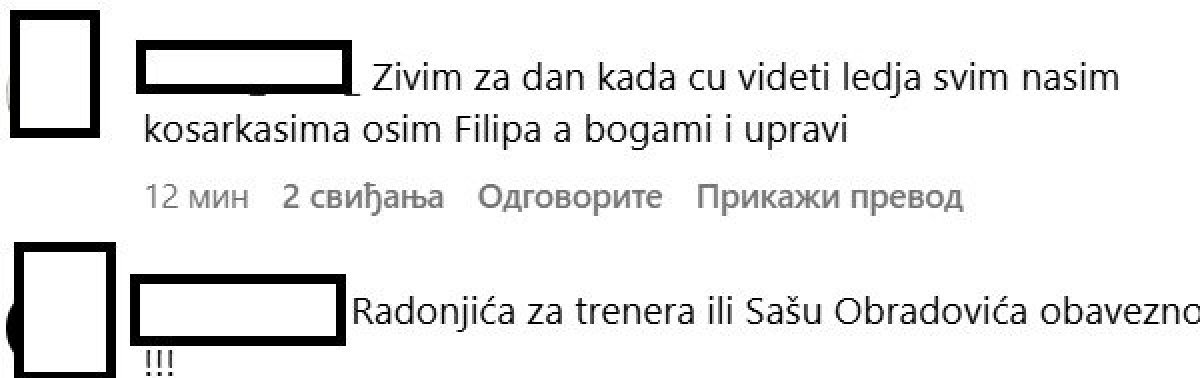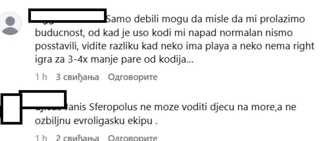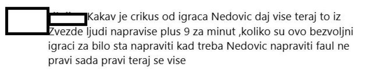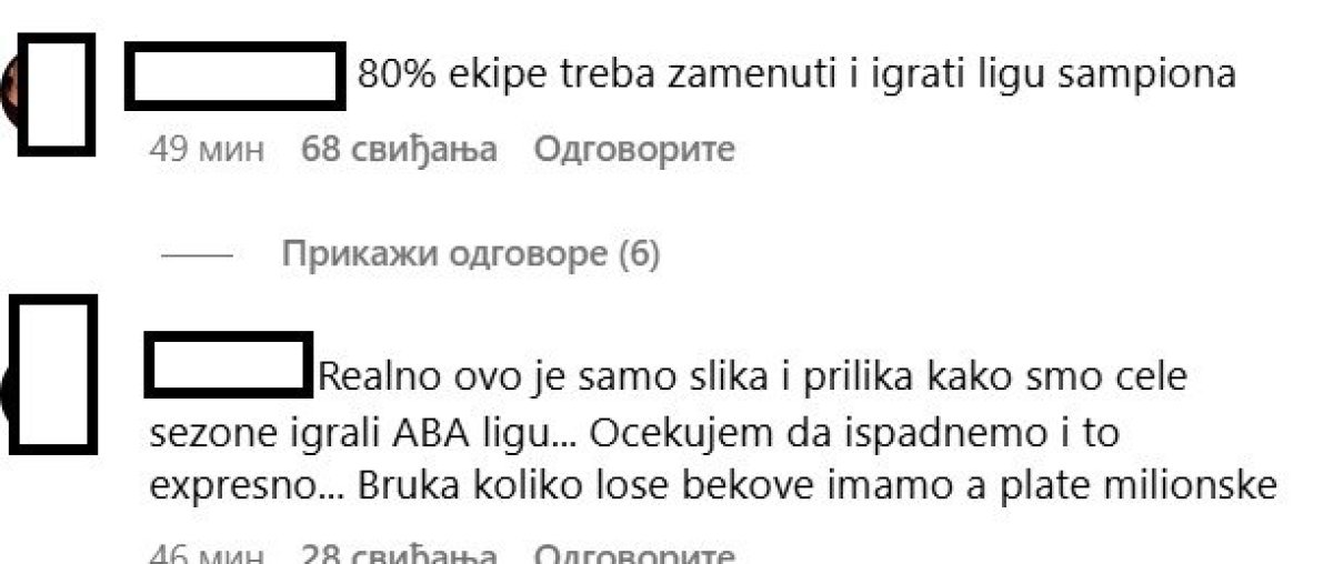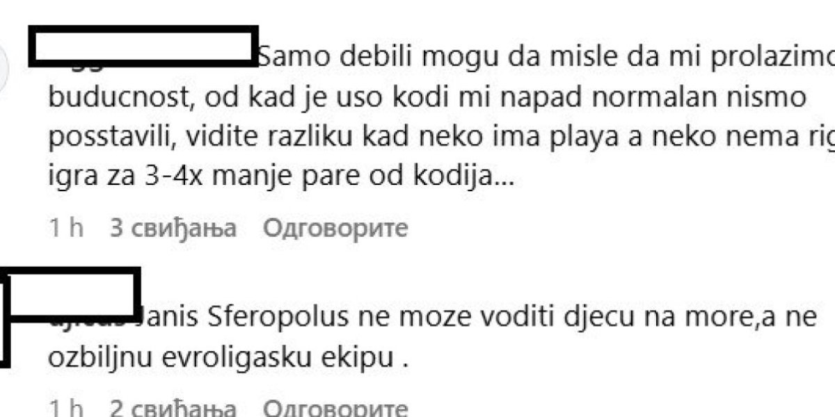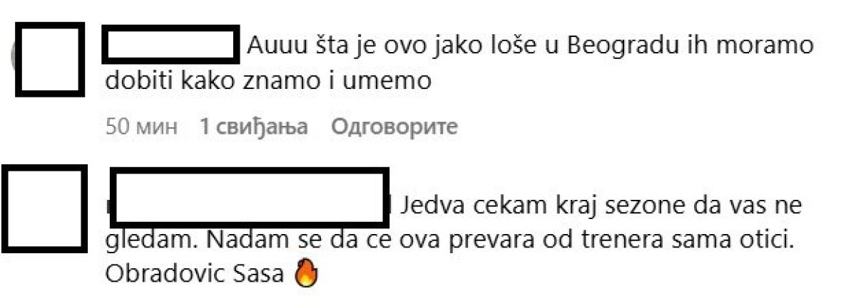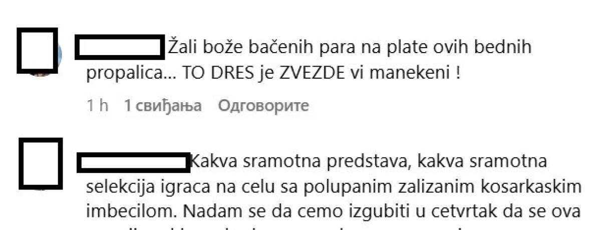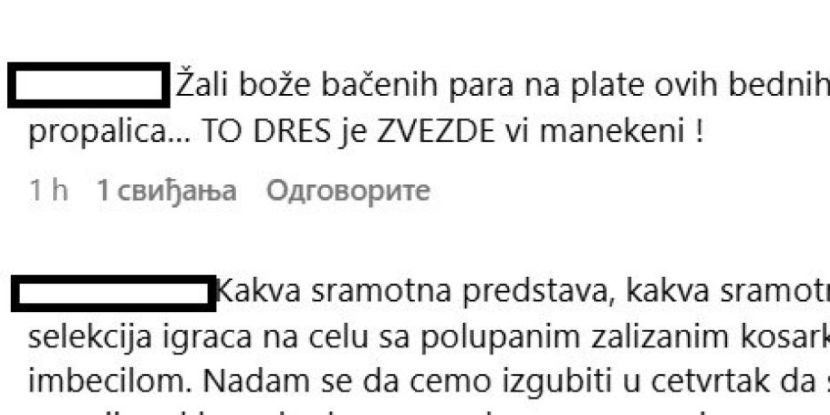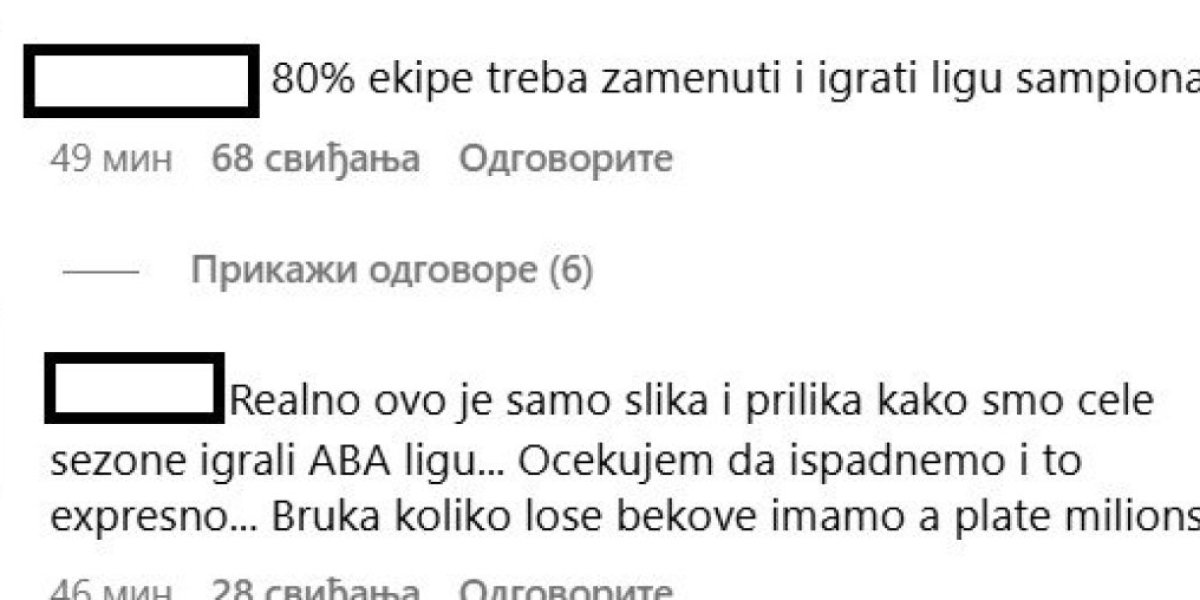 "Žali bože bačenih para na plate ovih bednih propalica… To dres je Zvezde vi manekeni", "Kakva sramotna predstava, kakva sramotna selekcija igrača na celu sa polupanim zalizanim kočarkačkim imbecilom. Nadam se da ćemo izgubiti u četvrtak da se ova agonija od kočarkačke sezone konačno završi".