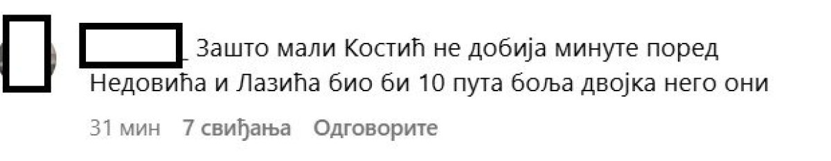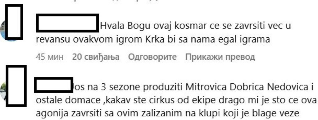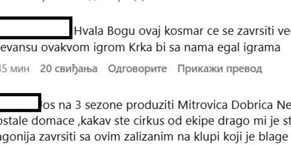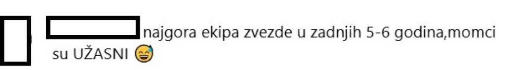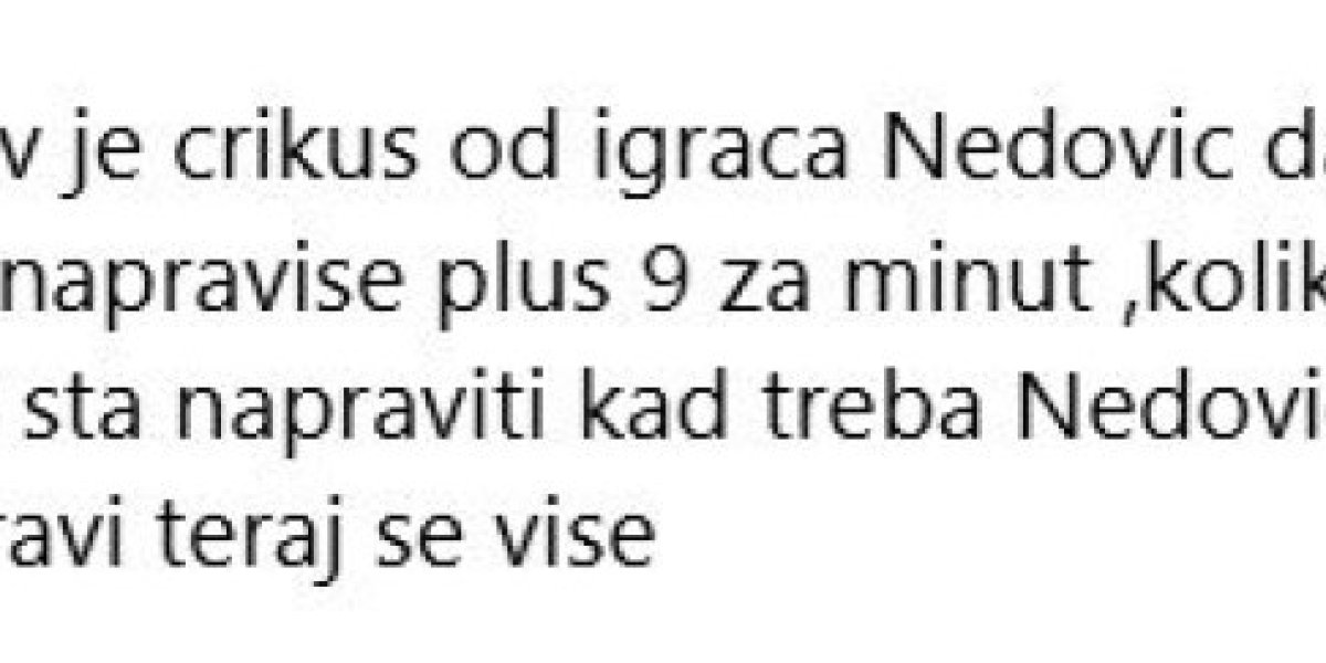 "80% ekipe treba zamenuti i igrati ligu sampiona", "Realno ovo je samo slika i prilika kako smo cele sezone igrali ABA ligu... Ocekujem da ispadnemo i to expresno... Bruka koliko loše bekove imamo a plate milionske", "Kakav je crikus od igraca Nedovic daj vise teraj to iz Zvezde ljudi napravise plus 9 za minut ,koliko su ovo bezvoljni igraci za bilo sta napraviti kad treba Nedovic napraviti faul ne pravi sada pravi teraj se vise", "Najgora ekipa zvezde u zadnjih 5-6 godina,momci su užasni"", Zašto mali Kostić ne dbije minute ispred Nedovića i Lazića, bio bi deset puta bolja svijka nego oni", "Hvala Bogu ovaj kosmar ce se zavrsiti vec u revansu ovakvom igrom Krka bi sa nama egal igrama", "Još na tri sezone produziti Mitrovića, Dobrića, Nedovića i ostale domaće ,kakav ste cirkus od ekipe drago mi je što će ova agonija završiti sa ovim zalizanim na klupi koji je blage veze vise nema", "Zivim za dan kada cu videti ledja svim nasim kosarkasima osim Filipa a bogami i upravi",