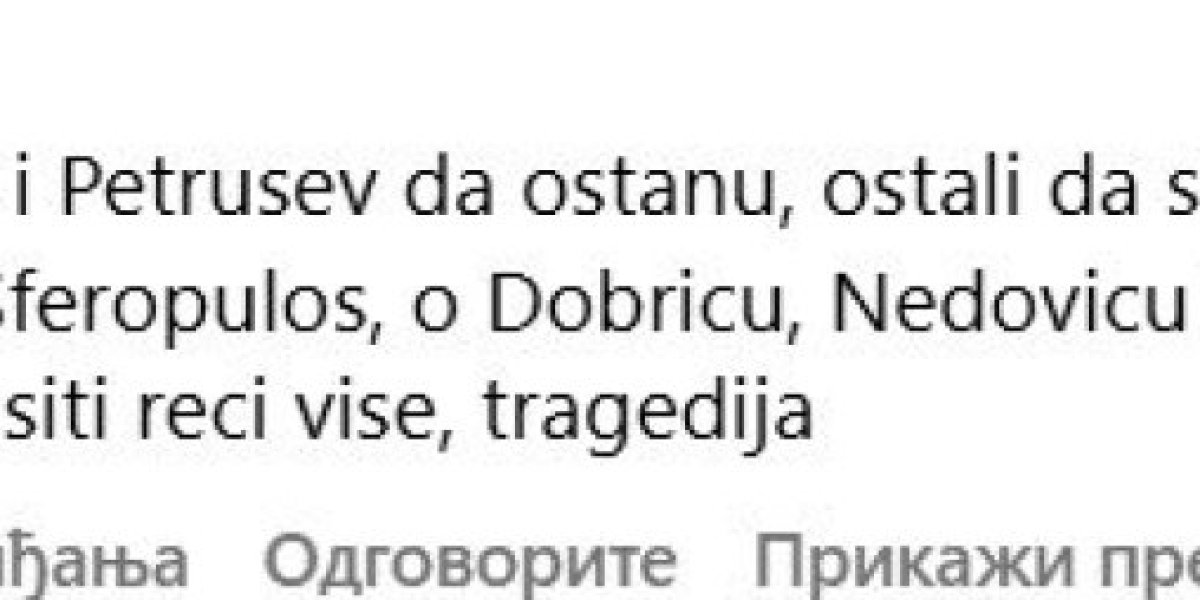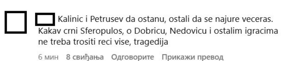 "Kalinić i Petrušev da ostanu, ostali da se najure večeras. Kakav crni Sferopulos, o Dobriću, Nedoviću i ostalim igracima ne treba trositi reci vise, tragedija".