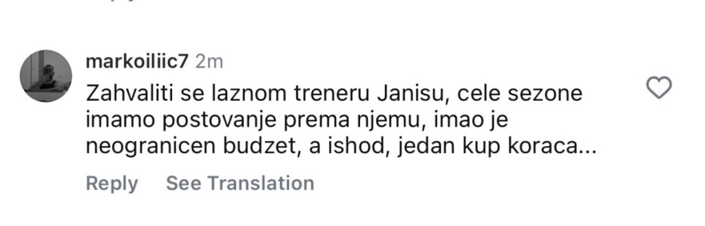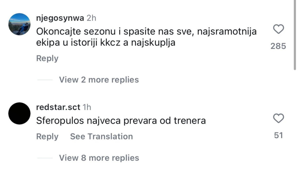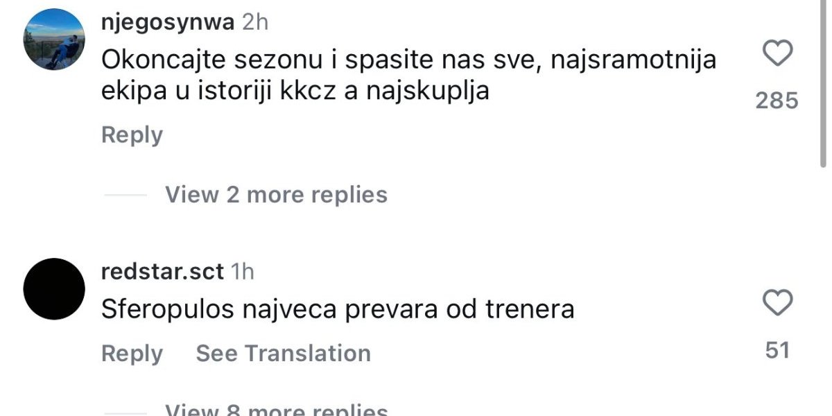 "Najsramotnija, a najskuplja ekipa u istoriji Crvene zvezde", "Sferopulos je naveća prevara od trenera", "Žali Bože ovakve igre", "Ovo je sramota za prave Zvezdaše", "Posle ovoga treba se zahvaliti lažnom treneru Janisu Sferopulosu, imao je neograničen budžet, a ishod samo jedan Kup Koraća", "Nadamo se da nikoga od vas nećemo gledati sledeće sezone", "Teški užas, ni stida, ni srama, ni blama", "Napustite klub, Janis napolje", samo su neki od komentara "delija" na društvenim mrežama.