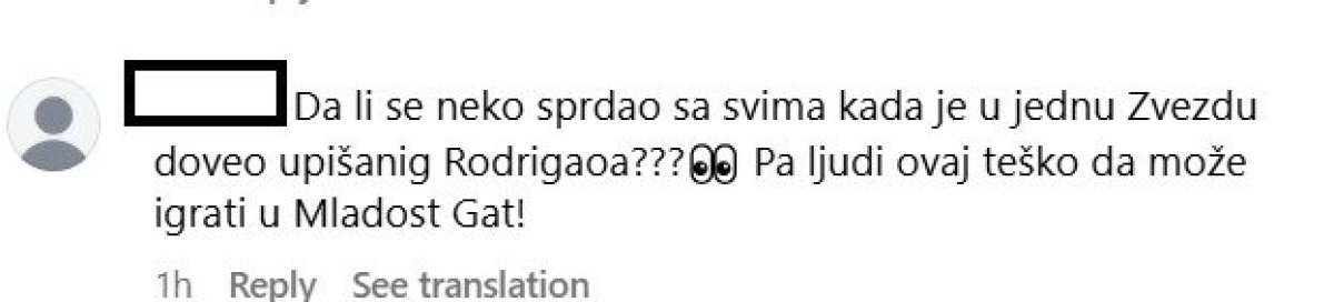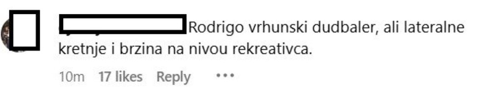 "Rodrigao pun pogodak, ali za naše protivnike. Propast", "Rodrigo vrhunski fudbaler, ali lateralne kretnje i brzina na nivou rekreativca", "Ako će biti ovakva igr u buduce bolje da istupimo iz LŠ", "Mora štoper da se dovede obavezno ovo na sta Rodrigao liči to je za Grafičar, imamo problem u kreaciji Krunić i Šljivić se kriju od lopte znaci fali dobra kreativni vezni i što opet Olajinka na desnoj strani zašto?", "Da li se neko sprdao sa svima kada je u jednu Zvezdu doveo upišanig Rodrigaoa? Pa ljudi ovaj teško da može igrati u Mladost Gat", samo su neki komnetari na račun novog pojačanja Crvene zvezde.