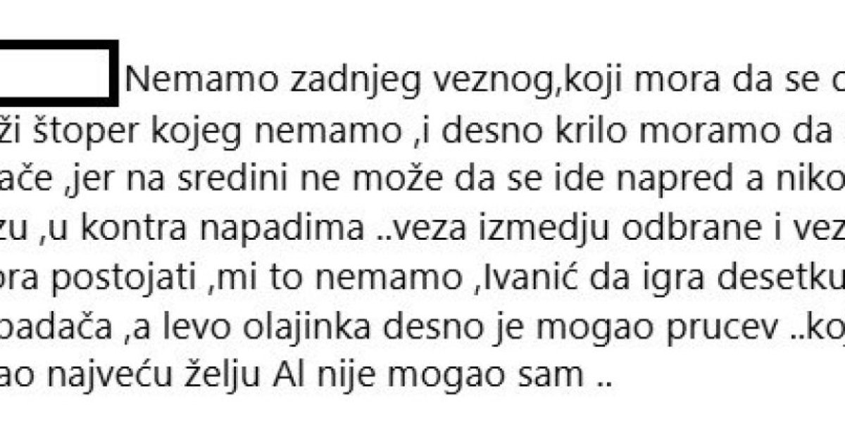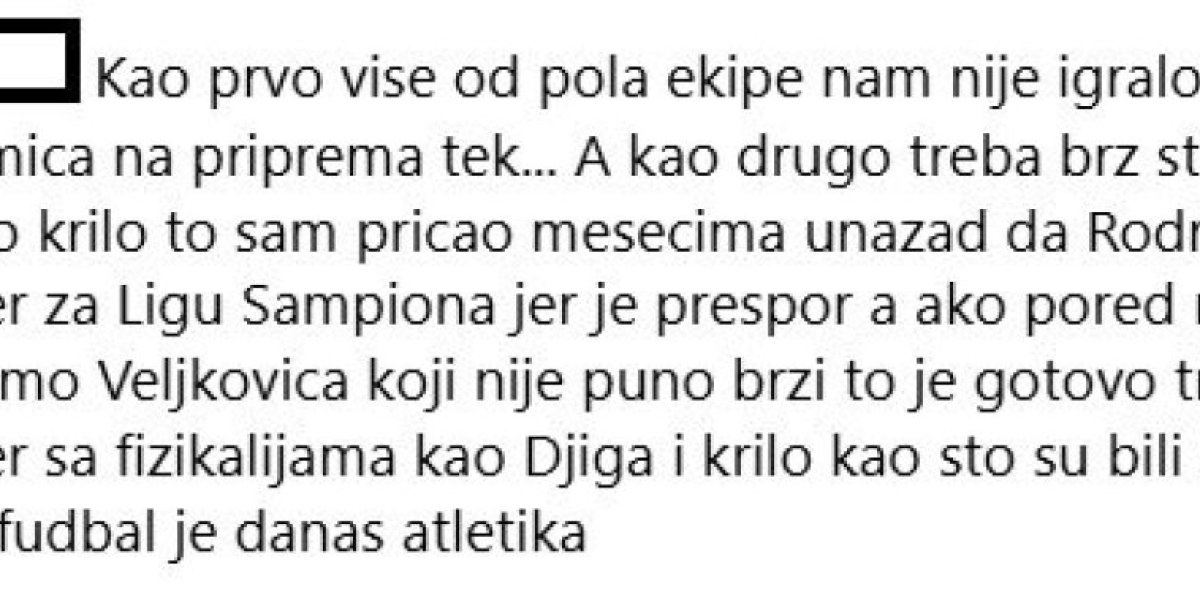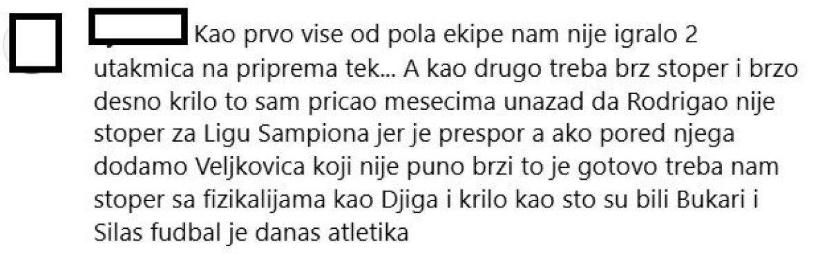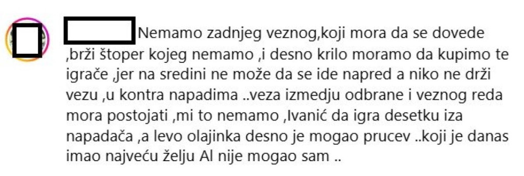 "Kao prvo više od pola ekipe nam nije igralo dve utakmica na priprema tek... A kao drugo treba brz štoper i brzo desno krilo to sam pričao mesecima unazad da Rodrigao nije štoper za Ligu šampiona jer je prespor a ako pored njega dodamo Veljkovića koji nije puno brzi to je gotovo treba nam štoper sa fizikalijama kao Điga i krilo kao što su bili Bukari i Silas fudbal je danas atletika", "Nemamo zadnjeg veznog koji mora da se dovede, brži štoper kojeg nemamo i desno krilo moramo da kupimo te igrače, jer na sredini ne može da se ide napred. a niko ne drži vezu, u kontra napadima, veza između odbrane i veznog reda mora postojati, mi to nemamo, Ivanić da igra desetku iza napadača, a levo Olajinka, desno je mogao Prucev koji je danas imao najveću želju ali nije mogao sam", "Već počeli sa pripremama? Neki još igraju prethodnih sezonu. Ni Zvezda nije što je nekada bila", "Baš fali neki kreator igre na sredini", želje su navijača šampiona Srbije.