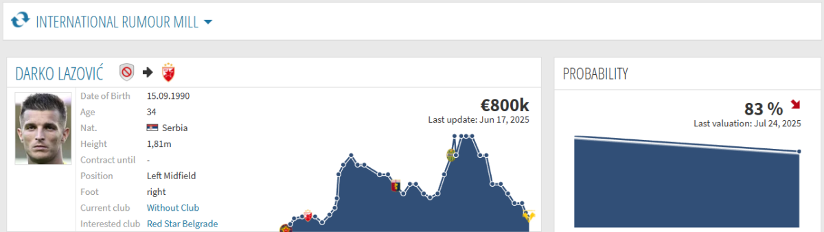Lazović je trenutno slobodan igrač i postoji intenzivan kontakt između njega i kluba, a Transfermarkt procenjuje njegov prelazak u Zvezdu sa visokih 83 odsto, što navijače dodatno uzbuđuje.