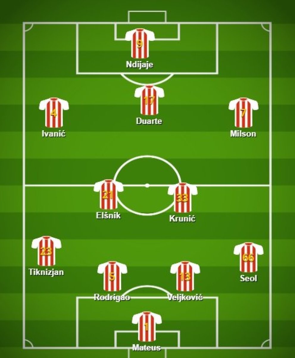 Mateus - Tiknizjan, Rodrigao, Veljković, Seol - Elšnik, Krunić - Ivanić, Duarte, Milson - Ndijaje.
