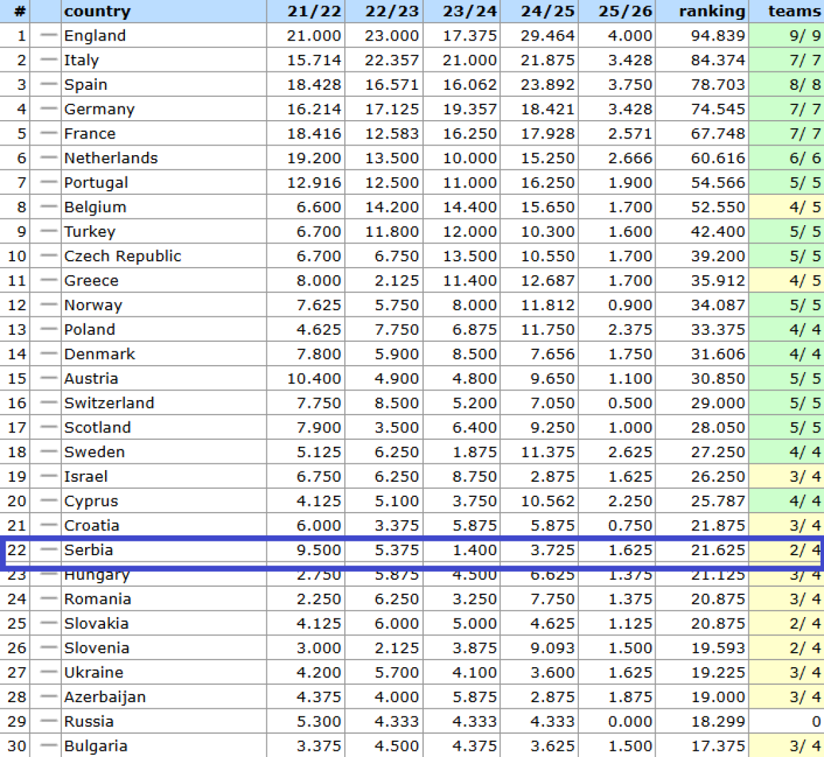 Kiprani imaju 25,787 na 20. mestu, dok su ispred njih Izrael sa 26,250, Švedska sa 27,250, Škotska ima 28,050, na 16. poziciji je Švajcarska sa 29,000 bodova, a 15. je Austrija sa 30,850 bodova. S druge strane, nama u leđa gledaju Mađarska sa 21,125 bodova, pošto je Ferencvaroš odoleo na gostovanju Ludogorecu u Bugarskoj, Rumunija i Slovačka, koje imaju 20,875, dok je Slovenija 26. na listi sa 19,593 bodova.