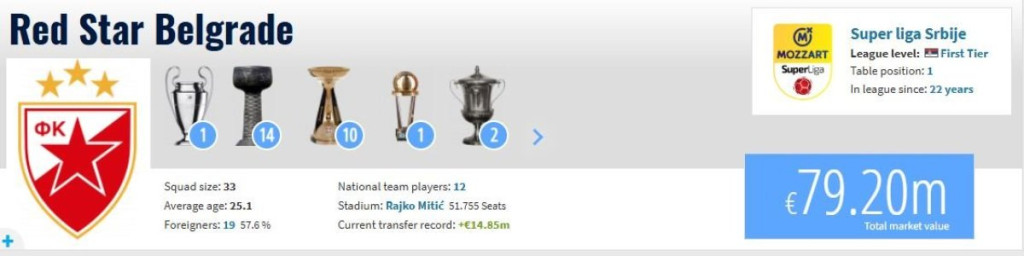 Prema podacima sa ugledne statističke platforme "Transfermarkt", igrački kadar Crvene zvezde procenjen je na 79,2 miliona evra. Najvredniji fudbaler u redovima srpskog šampiona je slovenački reprezentativac Timi Maks Elšnik, čija tržišna cena iznosi oko 8 miliona evra.