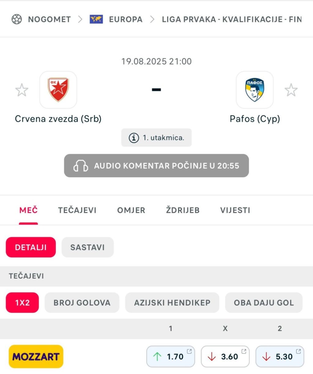 Fudbaleri Crvene zvezde večeras igraju prvi meč plej-ofa kvalifikacija za Ligu šampiona protiv kiparskog Pafosa. Duel na “Marakani” zakazan je za 21 čas, a navijači će moći da ga prate uživo na kanalima RTS 1 i Arena premijum 1, dok će tekstualni prenos biti dostupan na našem portalu Informer.rs.