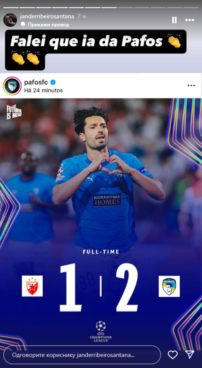 Bivši defanzivac Crvene zvezde i Pafosa Žander Ribeira oglasio se putem društvenih mreža kako bi proslavio pobedu kiparskog predstavnika na "Marakani".