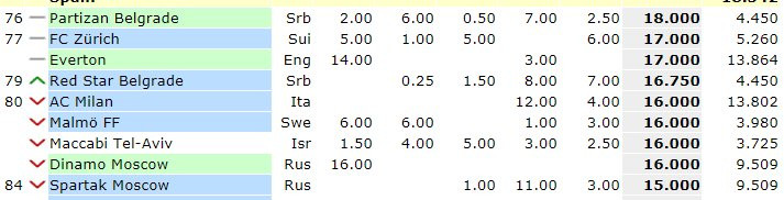 Partizan je na 76. mestu sa 18.000 bodova, a beogradske večite rivale još samo dele Everton i Cirih.