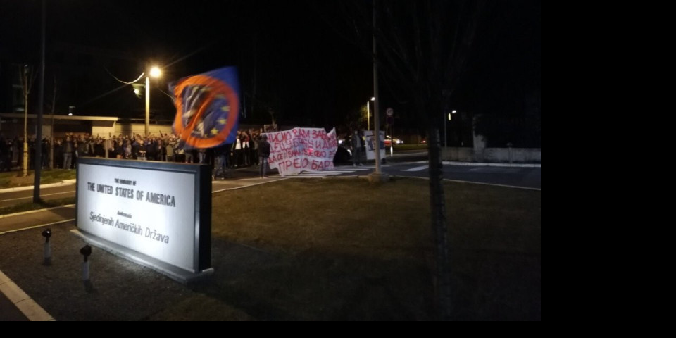 Sa raširenim zastavama i upaljenim bakljama, "delije" su u pravcu Američke ambasade skandirali pogrdan poklič: FU*K, FU*K, NATO PAKT, a ovom prilikom su i razvili zastavu na kojoj je crvenim slovima pisalo: