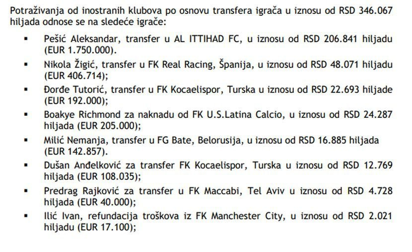 U izveštaju se navodi i da Zvezda ima potraživanja od Latine za Ričmonda Boaćija u visini od 205.000 evra, kao i od BATE Borisova za 142.857 evra i Makabija za transfer Predraga Rajkovića (40.000 evra).