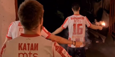 Pri kraju snimka prvotimci Zvezde, Dijego Falćineli, Aleksandar Katai i Miloš Degenek sa bakljama prolaze kroz kapiju i ulaze na teren.