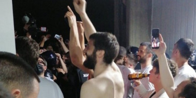 Igrači su nakon meča izašli da proslave sa navijačima pobedu, a za oko su nam zapali Ostin Holins koji je uz pivo skandirao ime Dejana Radonjića i Stefan Marković koji se pred navijačima pojavio samo u gaćama.